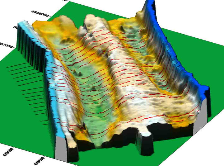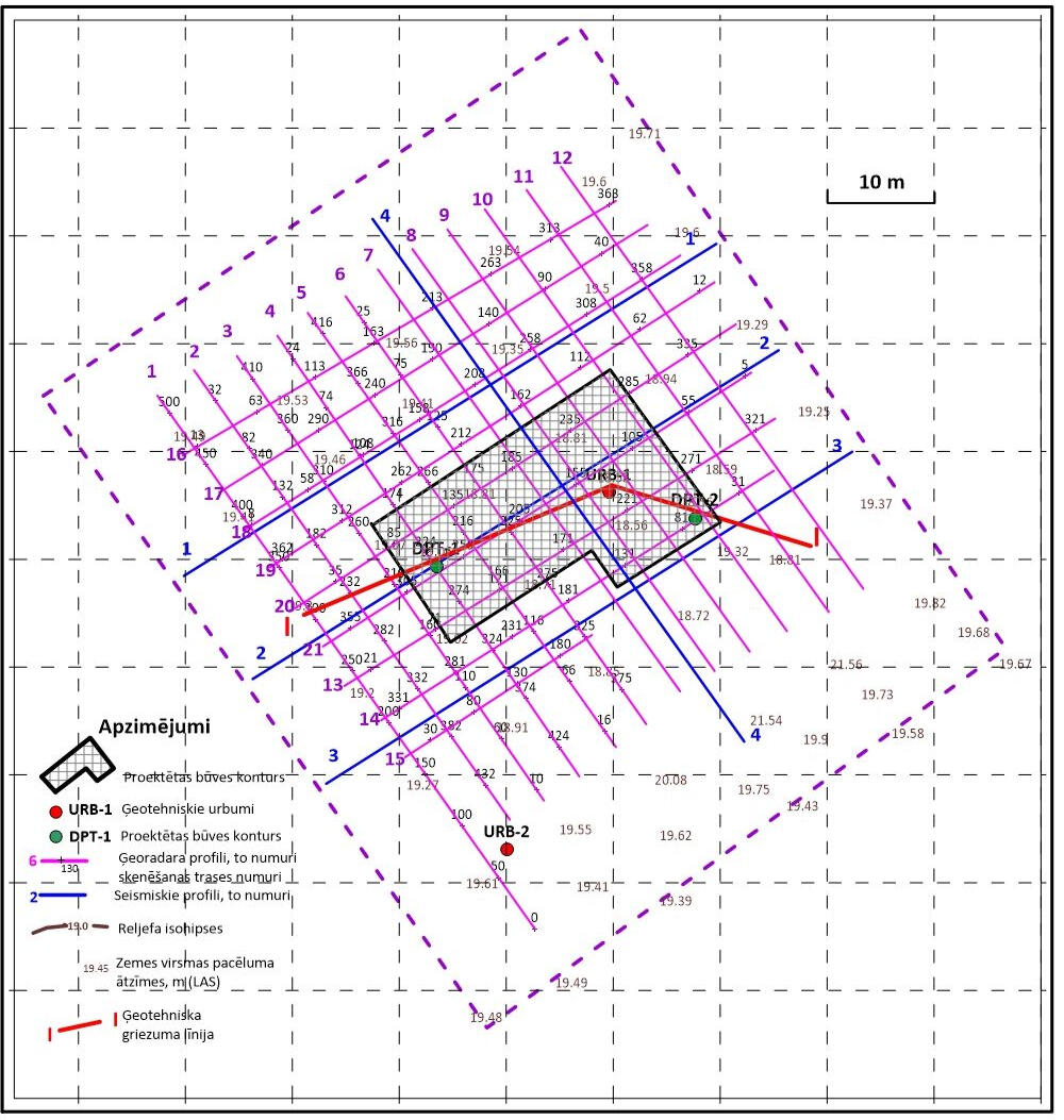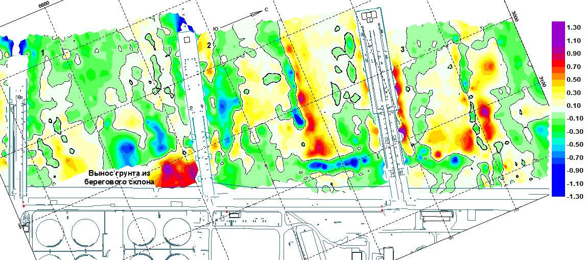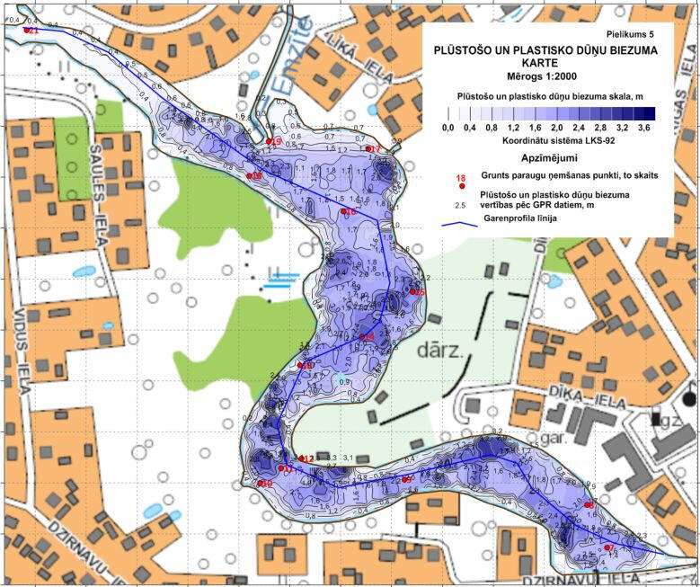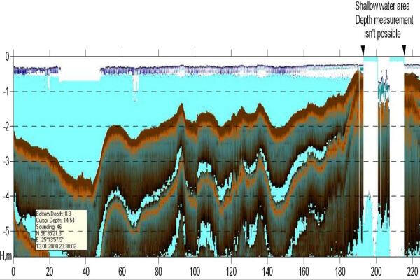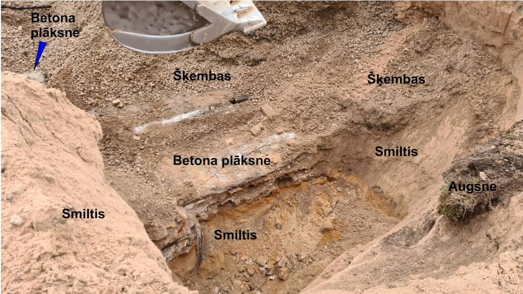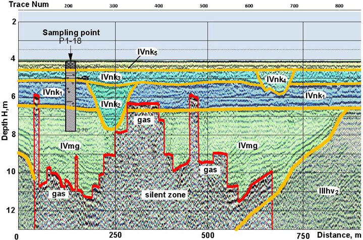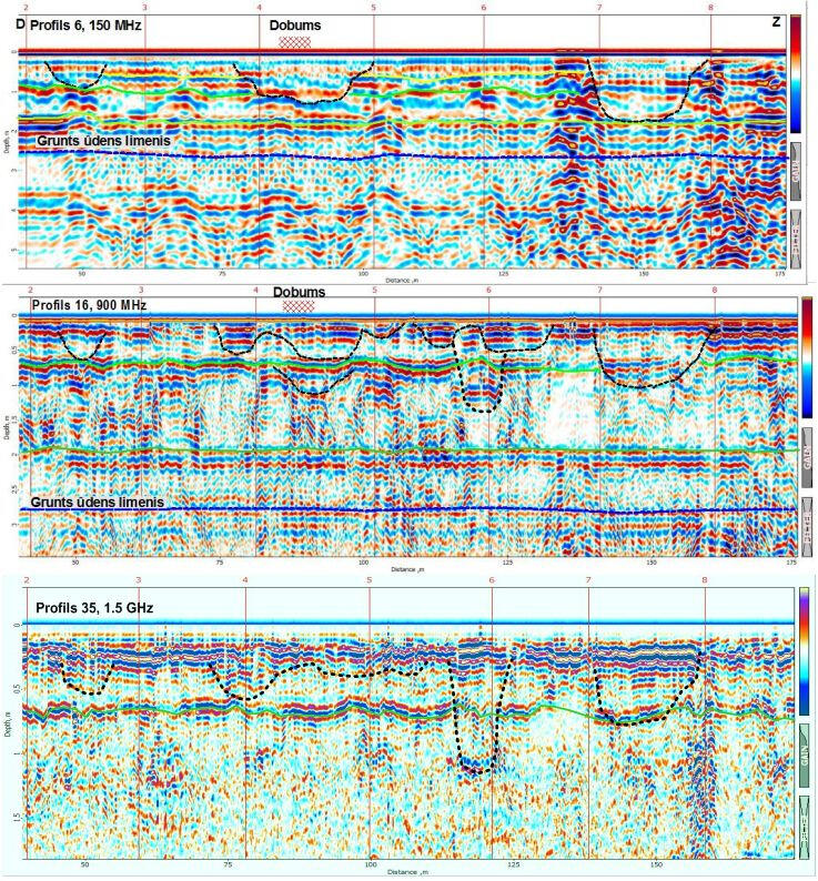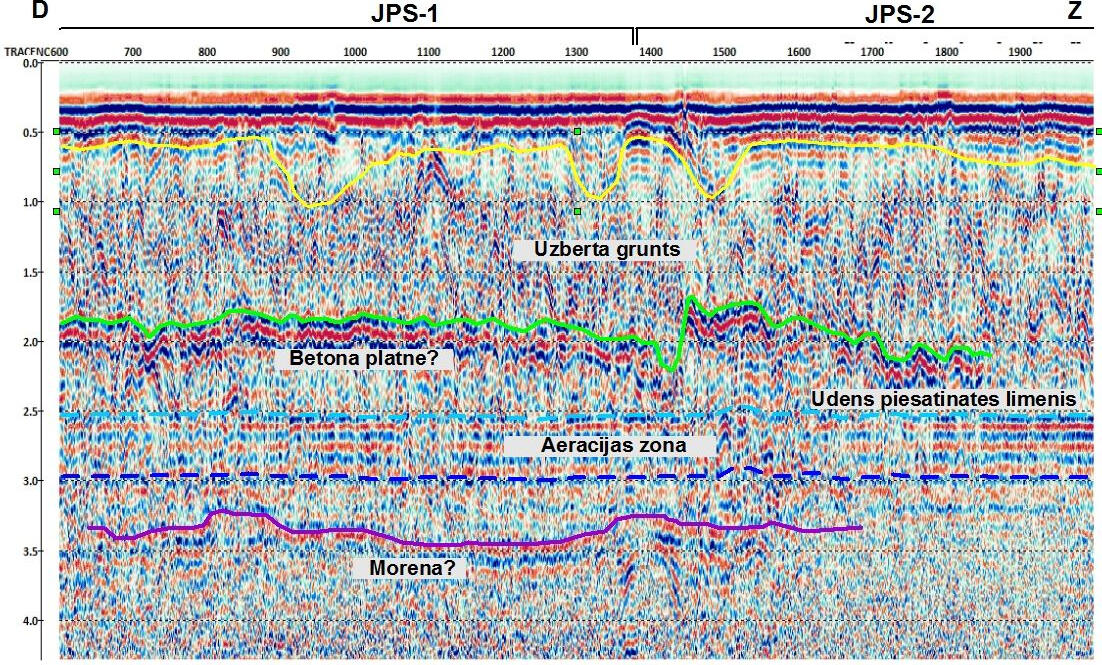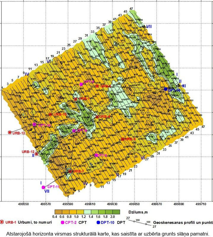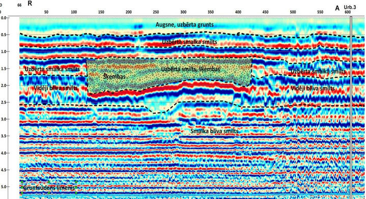 Pētījumu areā lielākajā daļā GPR griezumu kompleksā atstarojošā horizonta virsma ir diezgan skaidri redzama, kas atrodas 0,5 līdz 2,5 m dziļumā. Vietnē uz šīs atstarojošās virsmas var izsekot vairākas ieplakas, kuru dziļums ir no 1,0 līdz 2,2 m no virsmas. Dziļākā no tām izskatās kā šaura grava 6-15 m plata un stiepjas no izpētes vietas dienvidrietumu malas līdz tās centram ziemeļaustrumu virzienā. Tālāk uz rietumiem no izpētes vietas centra seko platāks, bet mazāk dziļš (līdz 1,6 m) turpinājums.Attēlā parādīta ieplaku dibenu virsmas strukturālā karte. Šo ieplaku dziļums atsevišķos gadījumos vietas sasniedz 2,5 m. Šīs atstarojošās robežas plaša ieplaka novērojama ziemeļrietumu virzienā izstieptas ieplakas veidā ar sarežģītu robežu konfigurāciju plānā pie vietas ziemeļaustrumu robežas. Spriežot pēc lielā lokālo neviendabīgumu skaita slānī virs šīs robežas, tas atspoguļo dalījumu starp tehnogēnās augsnes pildījumu un jūras (vai aluviālo) smilšainu un mālu nogulumu virsmu.