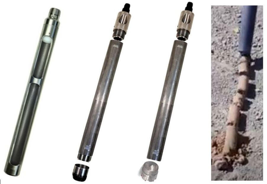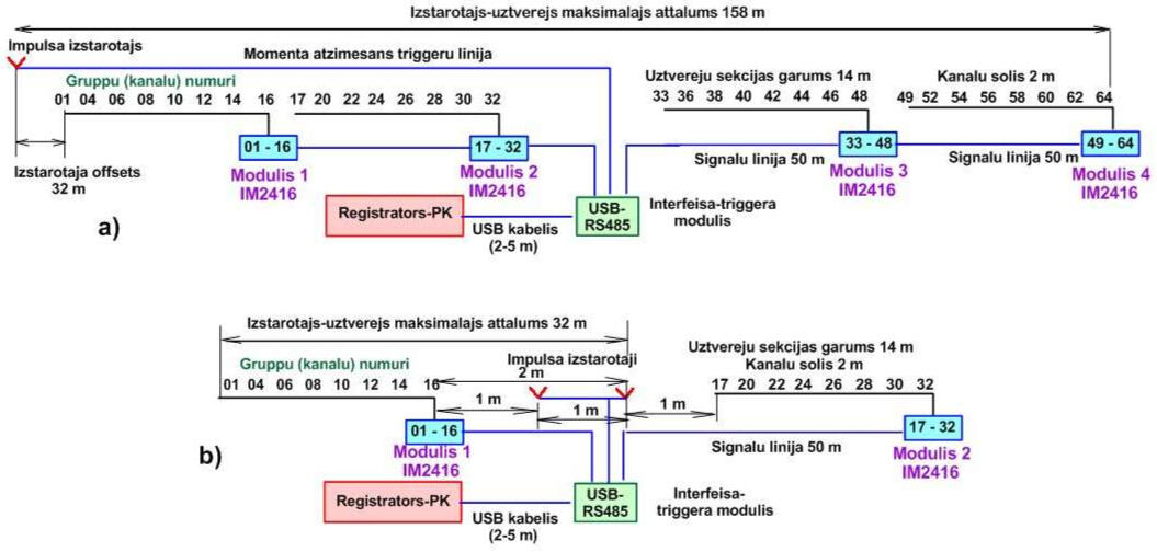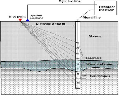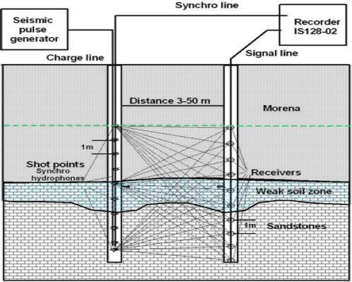Mērījumus veic trīs akās, kas vienā rindā urbtas 3 m attālumā viens no otra. Akas tiek stādītas ar polietilēna caurulēm ar pretvārstu apvalka apakšā un piepilda ar ūdeni. Apvalks ir aizbāzts ar māliem vai cementu vai piepildīts ar ūdeni. Mērījumu laikā impulsu emitētājs un uztvērējs tiek nolaists blakus esošajās akās tādā pašā dziļumā, kādu nodrošina tehniskās specifikācijas, tiek veikta impulsu ierosmju virkne, tiek reģistrēts kopējais signāls, un pēc tam emitētājs un uztvērējs tiek pārvietoti uz jaunām pozīcijām. Pirmoreiz emitētāju un uztvērēju nolaiž līdz ūdens līmeņa dziļumam urbumā, pēc tam tie pārvietojas apakšā ar intervālu 1,0–1,5 m, kā paredzēts Darba uzdēvumā.Saskaņā ar ASTM D 4428/D 4428M-07 vienkanāla režīmā tiek veiktas divas vai trīs garenisko un bīdes viļņu pārvietošanās laika mērījumu sērijas: ar emitētāju atrodas 1. urbumā, bet uztvērējus 2. urbumā - 3 m attālumā un 3. urbumā 6 m attālumā no urbuma 1. Akustiskā impulsa sākuma sinhronizācija ar ierakstīšanas sākumu tiek veikta, izmantojot pjezoelektrisko starta pārveidotāju, kas ievietots vienā tvertnē ar emitētāju un ar komunikācijas līnijas palīdzību savienots ar ierakstītāju.Attēlā parādīti pieraksti, kas iegūti no pjezokeramikas emitētāja ar impulsa frekvenci 4 kHz ar 20 darbību uzkrāšanos katrā mērījumu sērijā. Mērījumi tika veikti, apmesties uz 3 m (pa kreisi) un 6 m (pa labi). Reģistros pirmie tiešā garāmbraucošā gareniskā viļņa signāli tiek izsekoti lielākajā daļā izmeklēto dziļuma intervālu. Dolomītu biezumā vairāk nekā 18 m dziļumā signāla un trokšņa attiecība sasniedz 20-30. Sekcijas augšējā daļā strauji pasliktinās signālu pārejas apstākļi. Tas arī nav pietiekami pārliecināts, ka daudzos intervālos izceļas šķērsviļņa pienākšana.