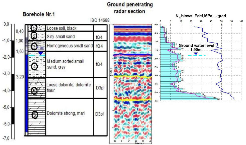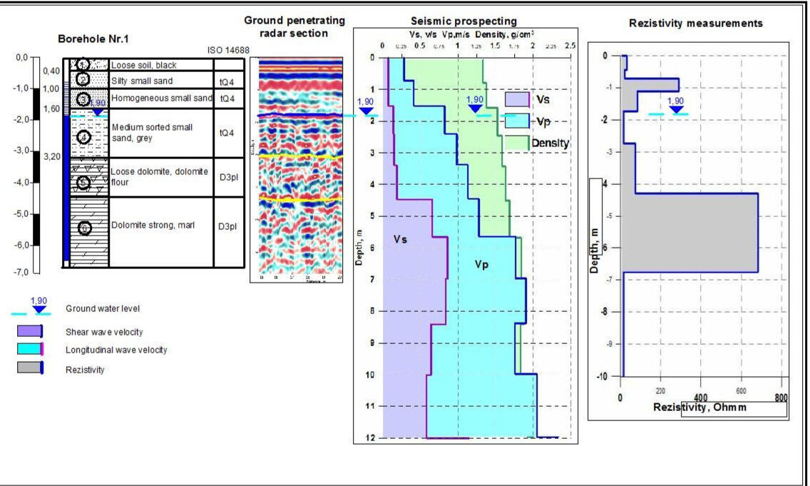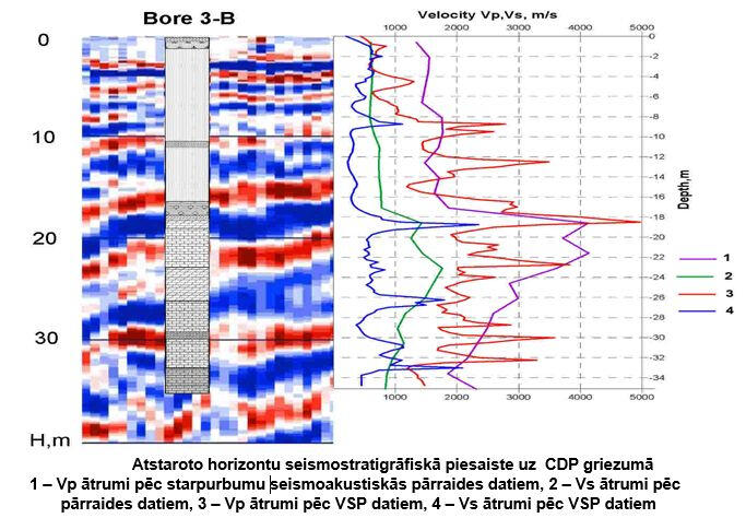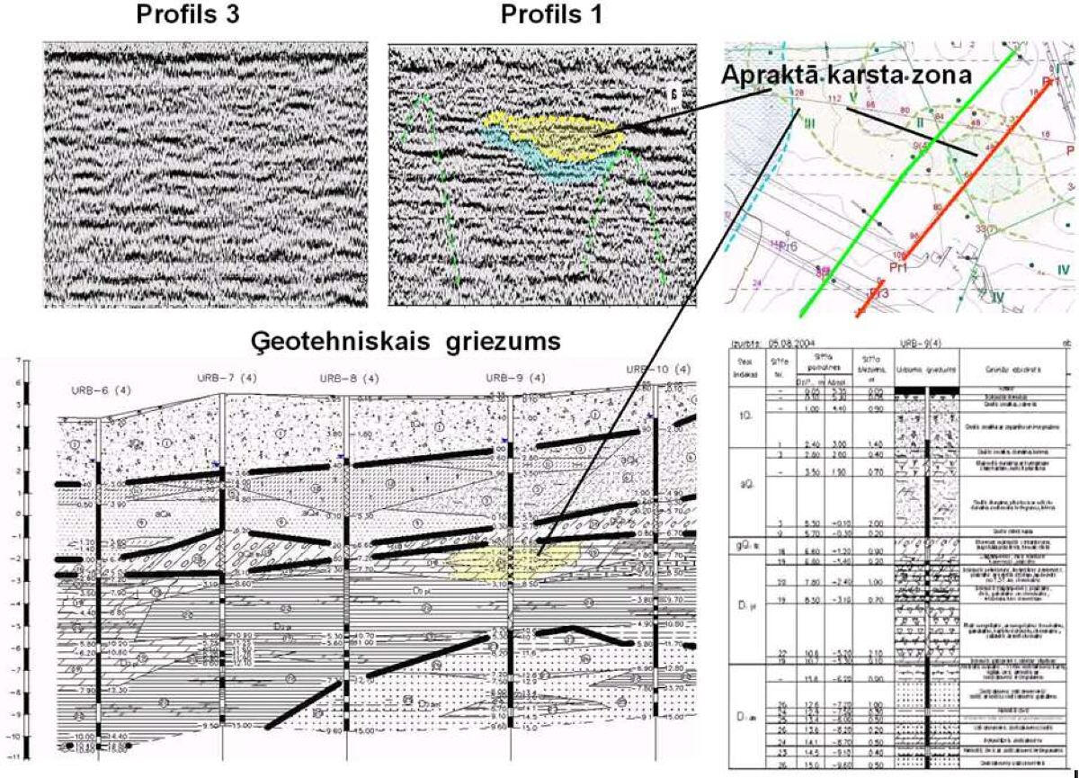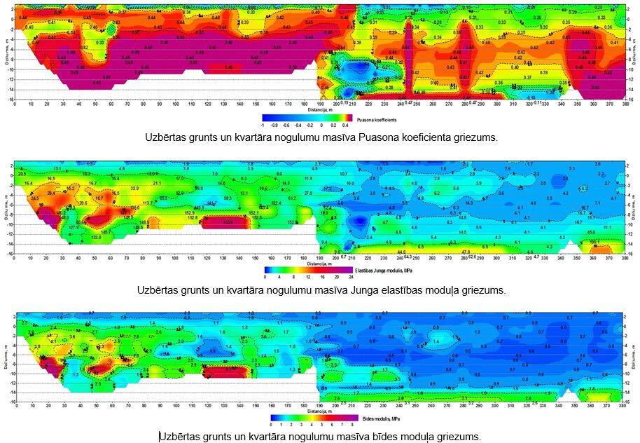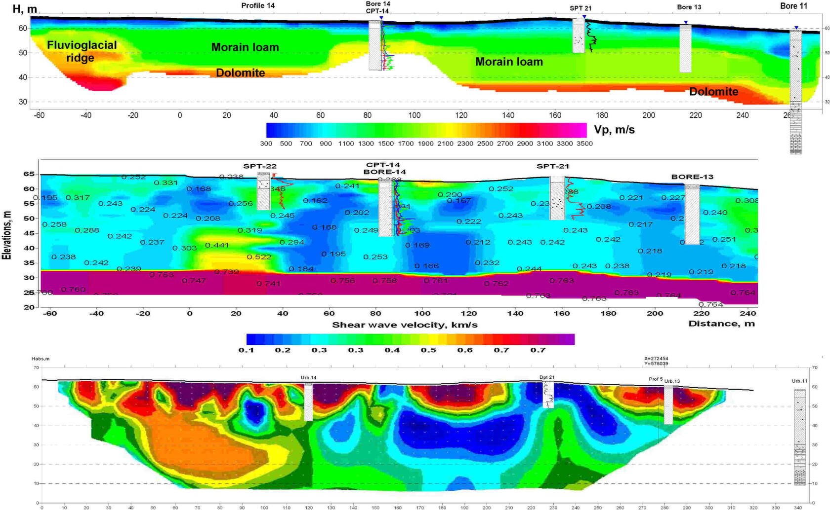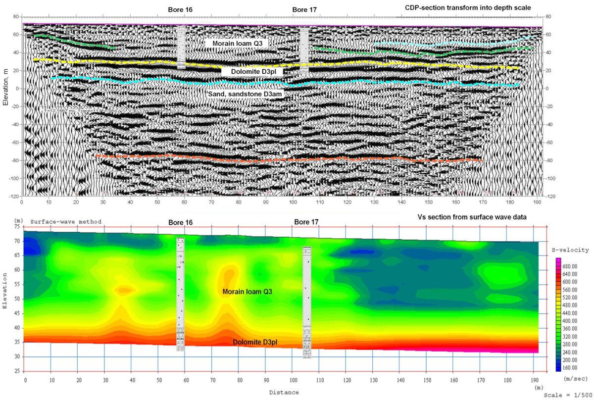 Attēlā parādītās griezumus raksturo tipisku ģeotehnisko metožu, urbšanas un ģeofizikas metožu reprezentativitātes attiecību, novērtējot augsnes masīva fizikālās īpašības. Neskatoties uz salīdzinoši lielo urbumu blīvumu un dinamiskās zondēšanas punktiem, tie nenodrošina inženierģeoloģisko elementu robežu telpisku uzbūvi relatīvi viendabīgā morēnas smilšmāla klājumā. Tajā pašā laikā bīdes viļņu ātrumi, kas galvenokārt raksturo augsnes skeleta īpašības, nodrošina skaidru telpisko ainu par rupju fragmentu (morēnas grēdām) griezumu ar palielinātu bīdes viļņu izplatīšanās ātrumu morēnas smilšmālās.Inženiertehniskajos apsekojumos augsnes masīvos un to piesātinošo šķidrumu stāvokļa un īpašību novērtēšanai parasti izmanto vairākus viļņu veidus: garenisko, atstaroto, refraģēto un virsmas. Zemāk redzamajā attēlā parādītas seismisko griezumu šķirnes gar vienu no profiliem Latvijas centrālajā daļā. Griezuma augšējā daļā līdz 35 m morēna smilšmāla, pēc tam apmēram 20 m Pļaviņas dolomīti, zemāk - Amat-Gauai smilšakmeņi. 160 m dziļumā (abas griezumos dziļuma skalā) KDP griezumā, iespējams, Amat-Gauai smilšakmeņu pamatnē, tiek izsekota diezgan labi uzturēta robeža.Šie materiāli tika iegūti, izmantojot kamanu āmuru, kas sver 8 kg, un vienu 64 kanālu uztveršanas izvietojumu ģeofoniem ar soli 2 m. Tomēr lauka darbu un datu apstrādes sarežģītība, lai iegūtu šīs griezumus, ievērojami atšķiras. Tātad, ja intervāls starp ierosmes punktiem bija 2 m, lai iegūtu KDP griezumu gar atstarotiem viļņiem, tad griezuma iegūšanai no refraģēto un virsmas viļņiem tika izmantotas tikai seismogrammas, kas iegūtas ar ierosmes punktu soli 16 m gar profilu.