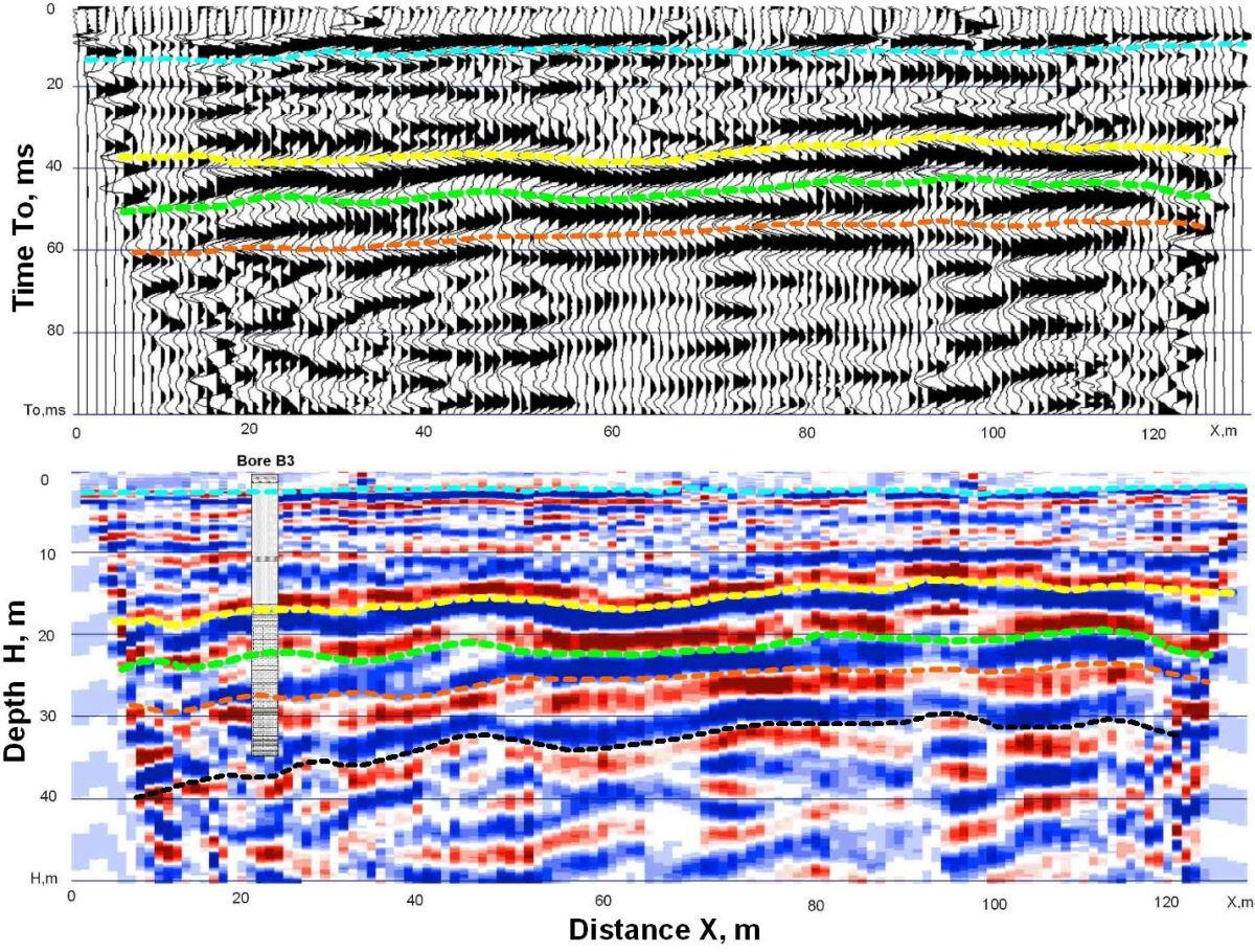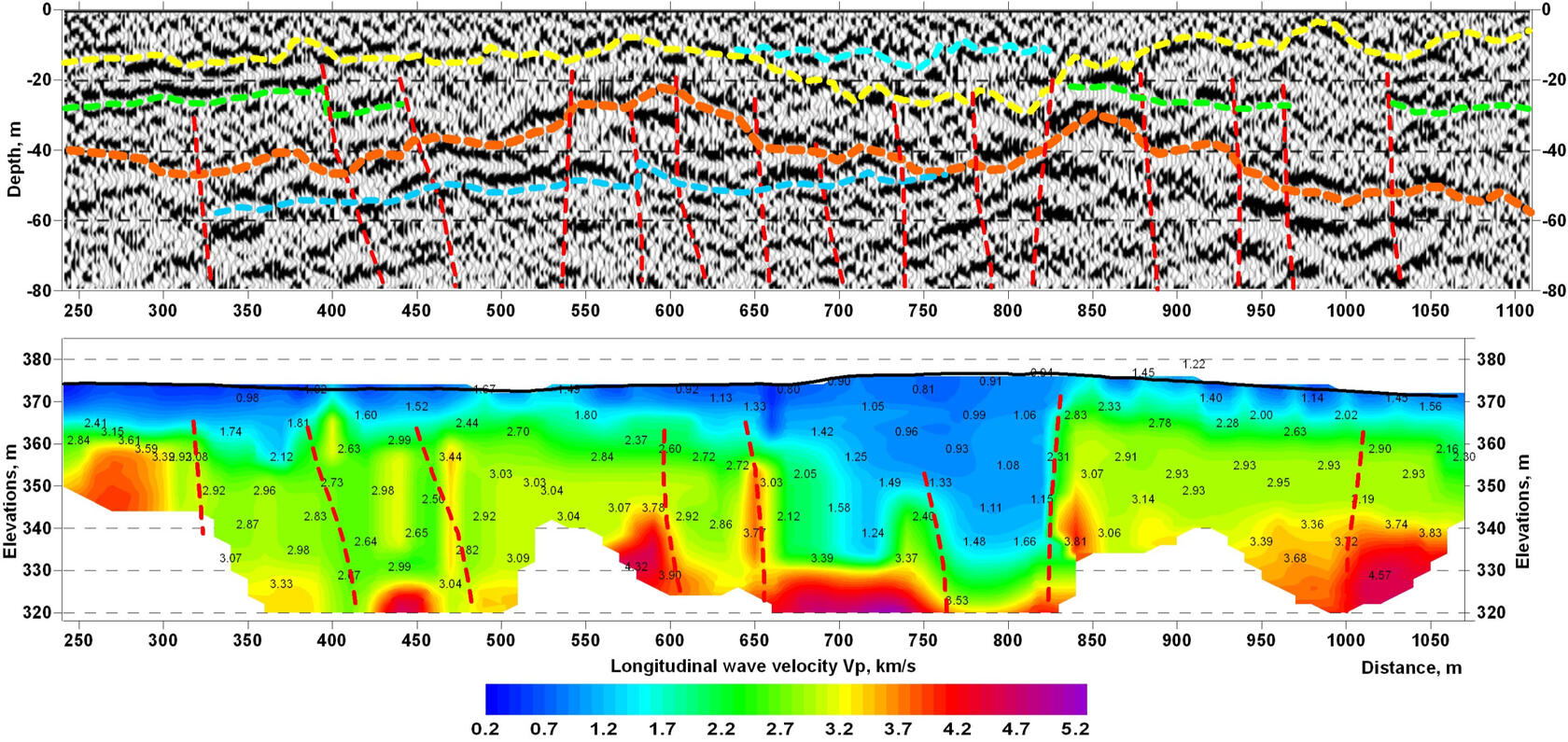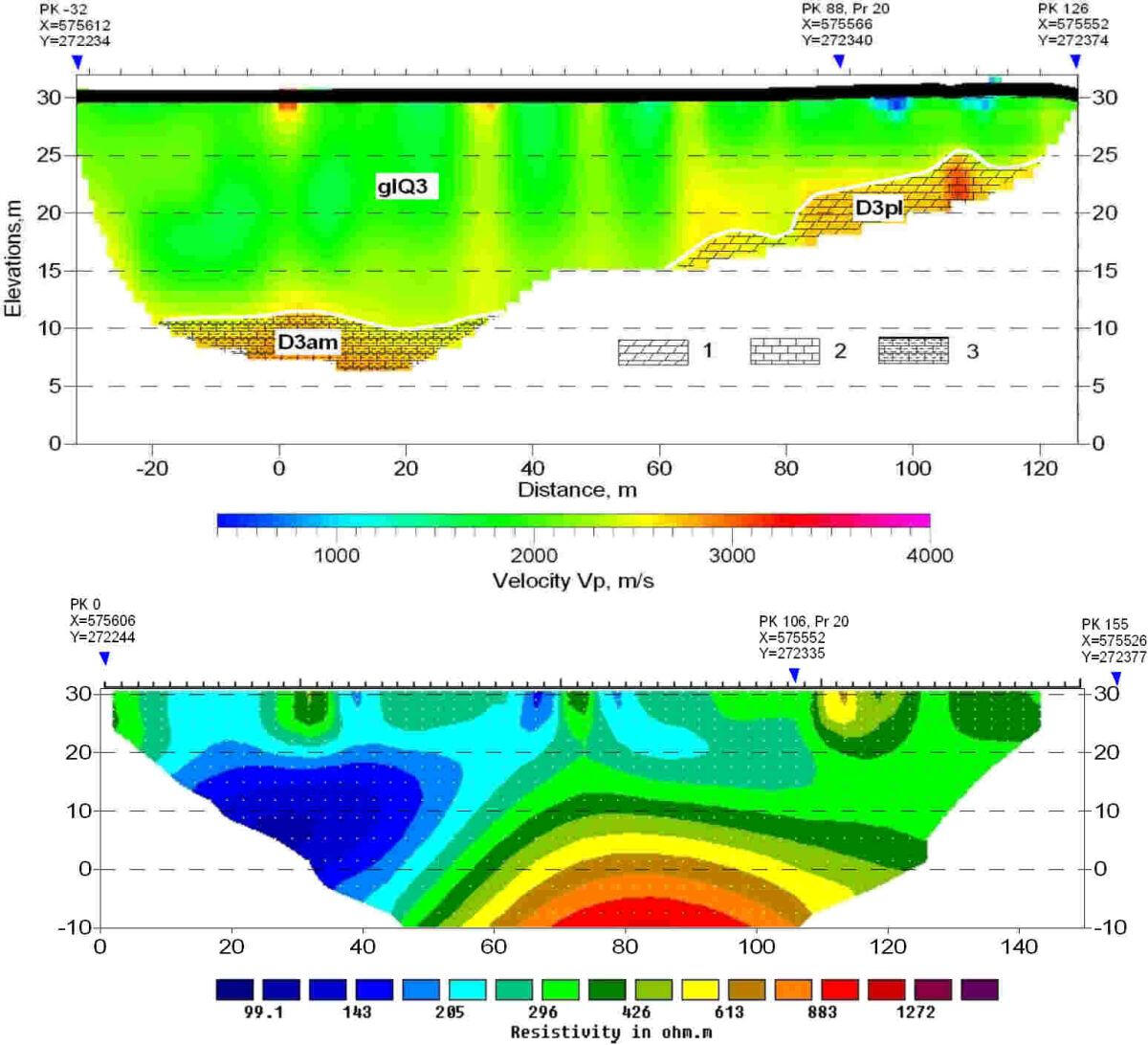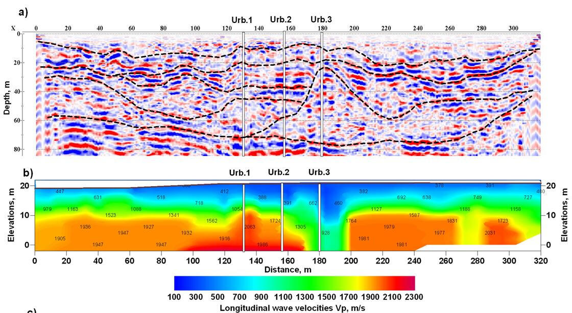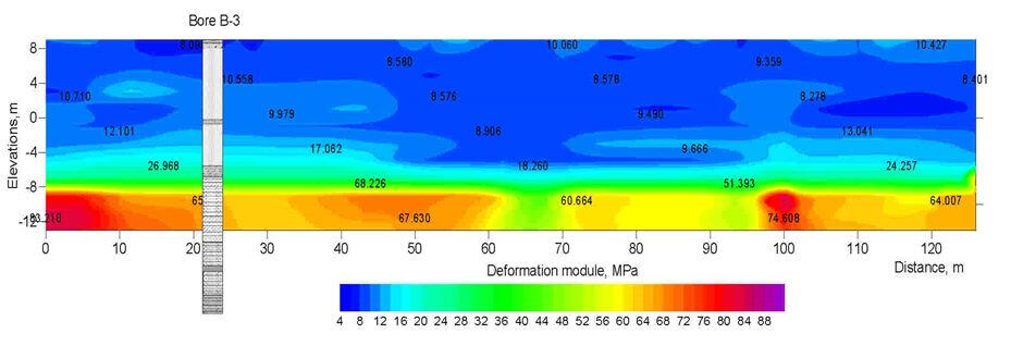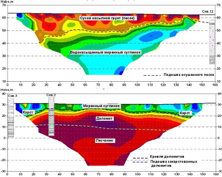 Attēlā parādītās griezumus raksturo tipisku ģeotehnisko metožu, urbšanas un ģeofizikas metožu reprezentativitātes attiecību, novērtējot augsnes masīva fizikālās īpašības. Neskatoties uz salīdzinoši lielo urbumu blīvumu un dinamiskās zondēšanas punktiem, tie nenodrošina inženierģeoloģisko elementu robežu telpisku uzbūvi relatīvi viendabīgā morēnas smilšmāla klājumā. Tajā pašā laikā bīdes viļņu ātrumi, kas galvenokārt raksturo augsnes skeleta īpašības, nodrošina skaidru telpisko ainu par rupju fragmentu (morēnas grēdām) griezumu ar palielinātu bīdes viļņu izplatīšanās ātrumu morēnas smilšmālās.Inženiertehniskajos apsekojumos augsnes masīvos un to piesātinošo šķidrumu stāvokļa un īpašību novērtēšanai parasti izmanto vairākus viļņu veidus: garenisko, atstaroto, refraģēto un virsmas. Zemāk redzamajā attēlā parādītas seismisko griezumu šķirnes gar vienu no profiliem Latvijas centrālajā daļā. Griezuma augšējā daļā līdz 35 m morēna smilšmāla, pēc tam apmēram 20 m Pļaviņas dolomīti, zemāk - Amat-Gauai smilšakmeņi. 160 m dziļumā (abas griezumos dziļuma skalā) KDP griezumā, iespējams, Amat-Gauai smilšakmeņu pamatnē, tiek izsekota diezgan labi uzturēta robeža.Šie materiāli tika iegūti, izmantojot kamanu āmuru, kas sver 8 kg, un vienu 64 kanālu uztveršanas izvietojumu ģeofoniem ar soli 2 m. Tomēr lauka darbu un datu apstrādes sarežģītība, lai iegūtu šīs griezumus, ievērojami atšķiras. Tātad, ja intervāls starp ierosmes punktiem bija 2 m, lai iegūtu KDP griezumu gar atstarotiem viļņiem, tad griezuma iegūšanai no refraģēto un virsmas viļņiem tika izmantotas tikai seismogrammas, kas iegūtas ar ierosmes punktu soli 16 m gar profilu.