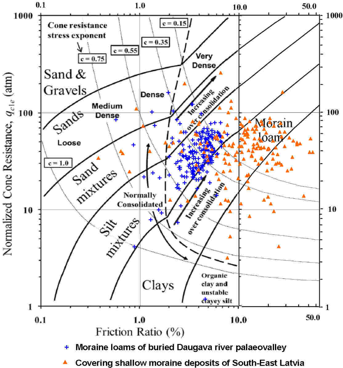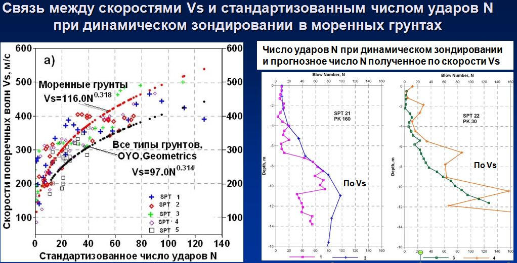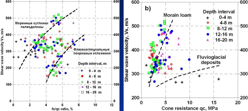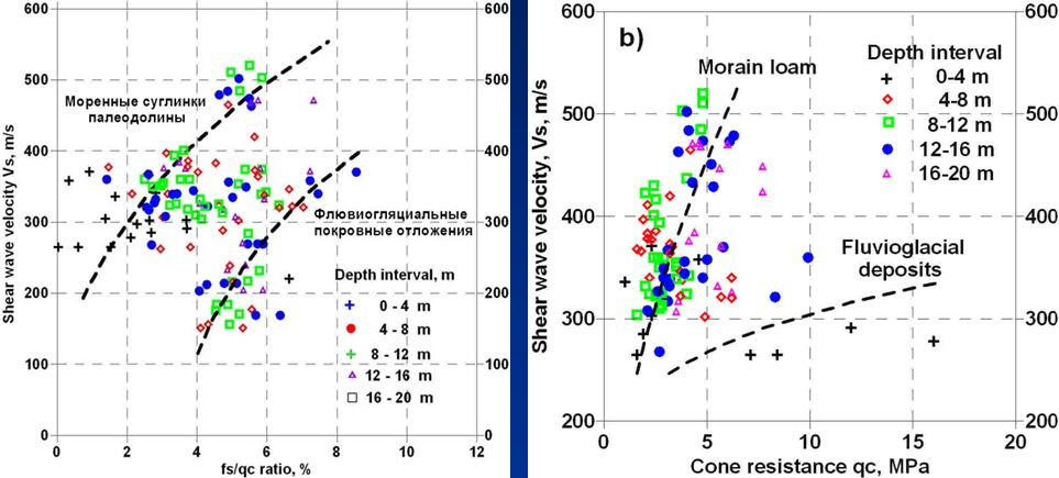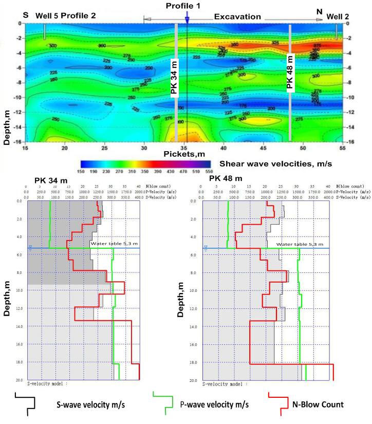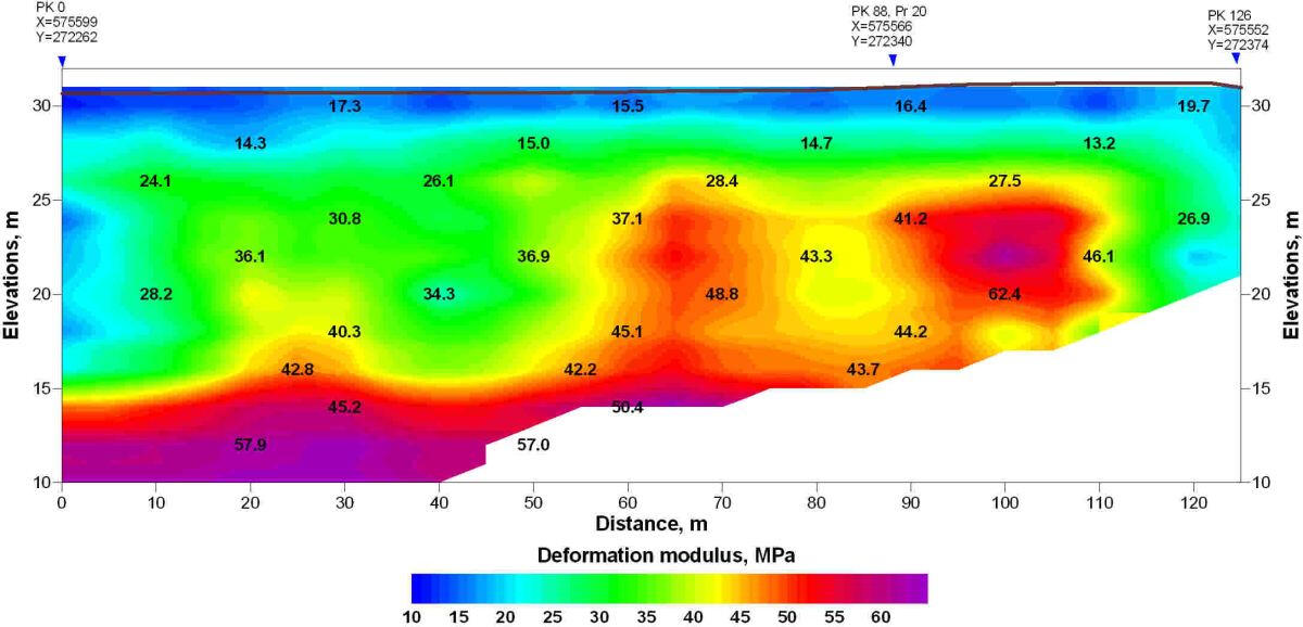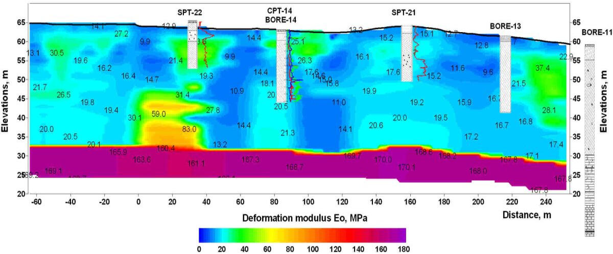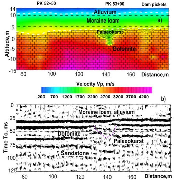 Attēlā parādītās griezumus raksturo tipisku ģeotehnisko metožu, urbšanas un ģeofizikas metožu reprezentativitātes attiecību, novērtējot augsnes masīva fizikālās īpašības. Neskatoties uz salīdzinoši lielo urbumu blīvumu un dinamiskās zondēšanas punktiem, tie nenodrošina inženierģeoloģisko elementu robežu telpisku uzbūvi relatīvi viendabīgā morēnas smilšmāla klājumā. Tajā pašā laikā bīdes viļņu ātrumi, kas galvenokārt raksturo augsnes skeleta īpašības, nodrošina skaidru telpisko ainu par rupju fragmentu (morēnas grēdām) griezumu ar palielinātu bīdes viļņu izplatīšanās ātrumu morēnas smilšmālās.Inženiertehniskajos apsekojumos augsnes masīvos un to piesātinošo šķidrumu stāvokļa un īpašību novērtēšanai parasti izmanto vairākus viļņu veidus: garenisko, atstaroto, refraģēto un virsmas. Zemāk redzamajā attēlā parādītas seismisko griezumu šķirnes gar vienu no profiliem Latvijas centrālajā daļā. Griezuma augšējā daļā līdz 35 m morēna smilšmāla, pēc tam apmēram 20 m Pļaviņas dolomīti, zemāk - Amat-Gauai smilšakmeņi. 160 m dziļumā (abas griezumos dziļuma skalā) KDP griezumā, iespējams, Amat-Gauai smilšakmeņu pamatnē, tiek izsekota diezgan labi uzturēta robeža.Šie materiāli tika iegūti, izmantojot kamanu āmuru, kas sver 8 kg, un vienu 64 kanālu uztveršanas izvietojumu ģeofoniem ar soli 2 m. Tomēr lauka darbu un datu apstrādes sarežģītība, lai iegūtu šīs griezumus, ievērojami atšķiras. Tātad, ja intervāls starp ierosmes punktiem bija 2 m, lai iegūtu KDP griezumu gar atstarotiem viļņiem, tad griezuma iegūšanai no refraģēto un virsmas viļņiem tika izmantotas tikai seismogrammas, kas iegūtas ar ierosmes punktu soli 16 m gar profilu.