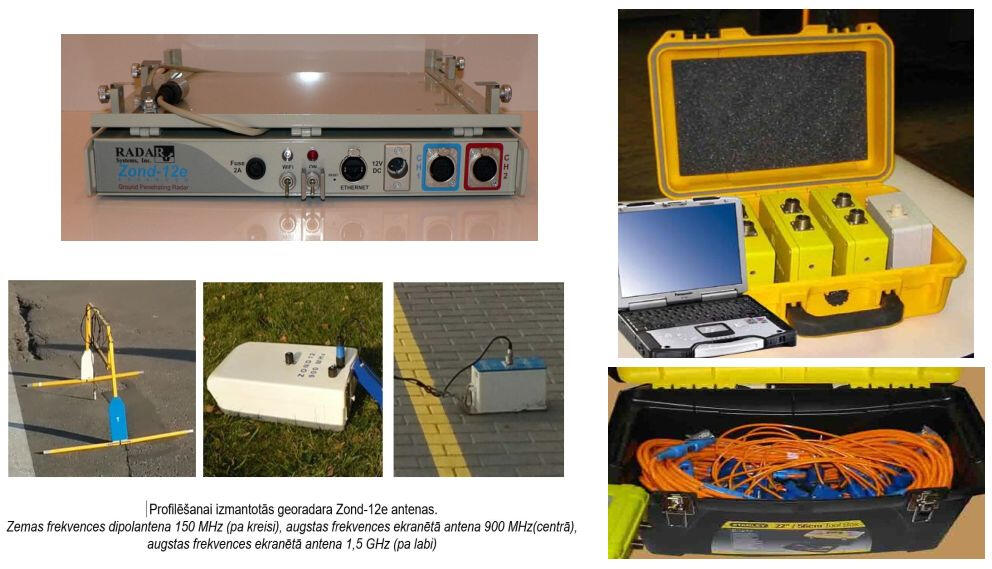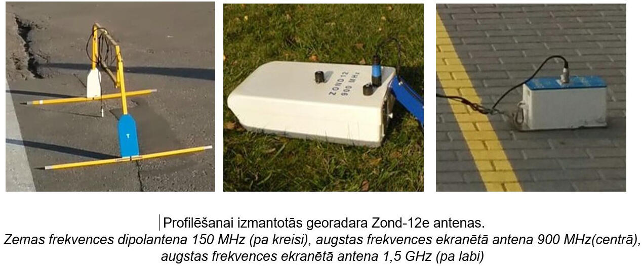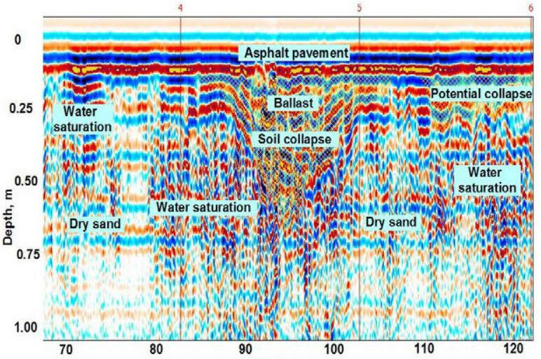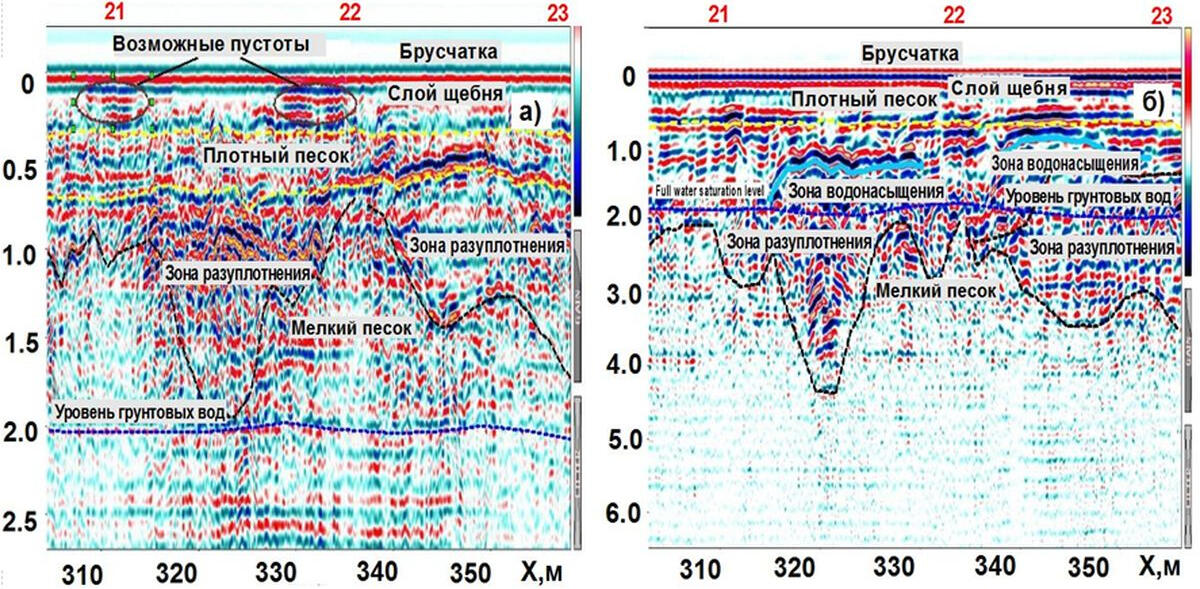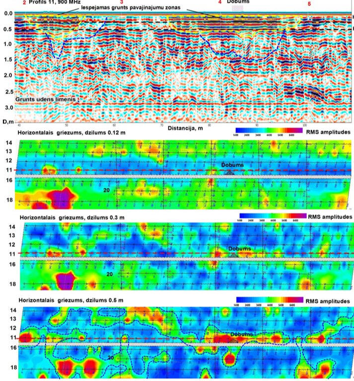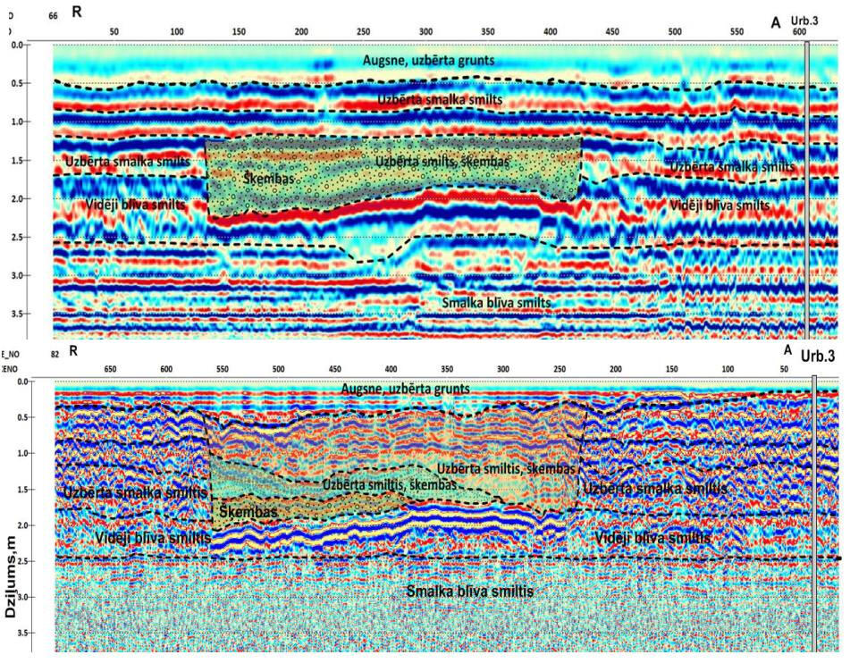 Ekranētas augstas frekvences antenas izmantošana ir efektīvāka pilsētu teritorijās, nosakot augsnes noblivejumu zonas zem ceļu un brauktuves cietajiem segumiem noteikšanai. Zemāk redzamajā attēlā parādīts uzbērumā grunts masīva pamatotu datu interpretācijas piemērs. Zem bruģa un šķembu uzbērumiem tiek izsekotas palielinātas atstarošanās amplitūdas un novēlots to reģistrācijas laiks, kas saistīts ar iespējamām noblivejumu zonām un paaugstinātu ūdens piesātinājumu smilšainā augsnē.Radaru profilu piemēri, kas iegūti, izmantojot ekranētu augstfrekvences (900 MHz) antenu (pa kreisi) un dipola zemfrekvences (150 MHz) antenu (pa labi) krastmalas daļā ar bruģakmeņiem.Sakarā ar lietus ūdens uzkrāšanos bruģakmeņos bija iespējams iekļūt grants un augsnes virsējā slānī, kas ievērojami maina un sarežģī viļņu modeli ierakstos sakarā ar straujām augsnes dielektriskās konstantes izmaiņām.