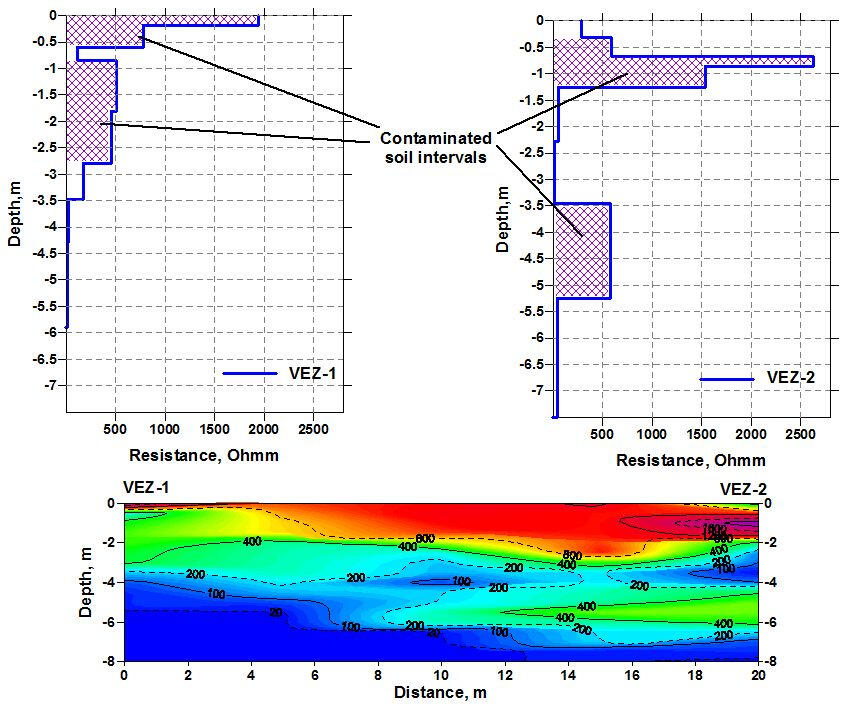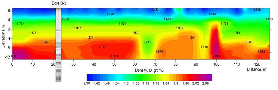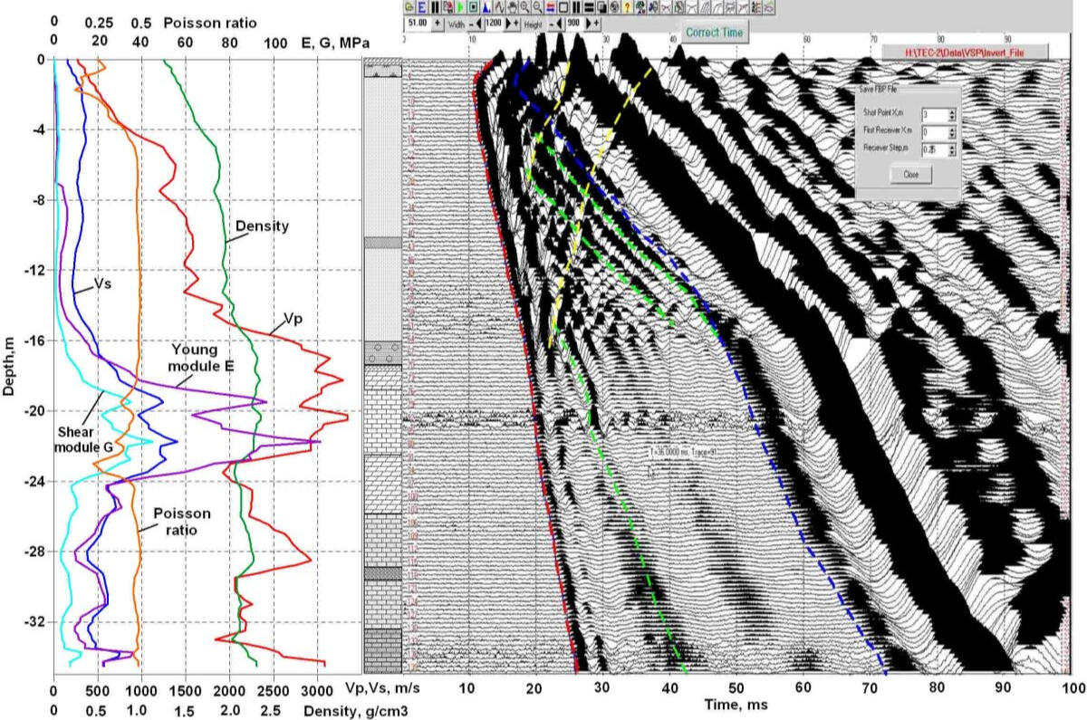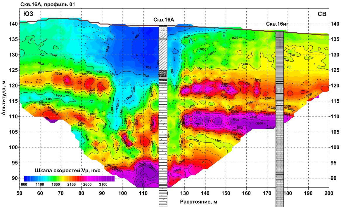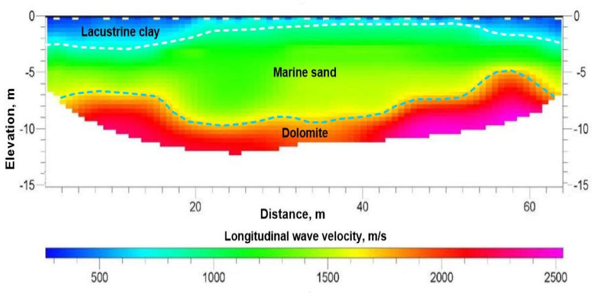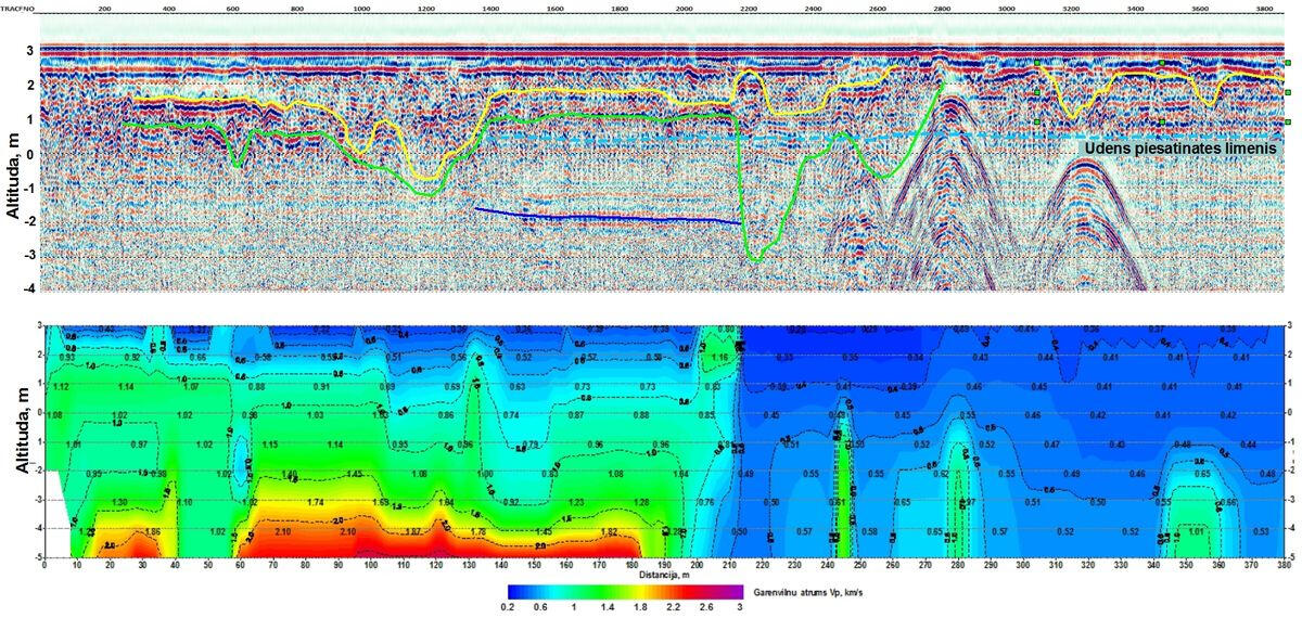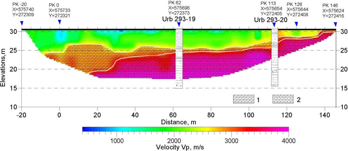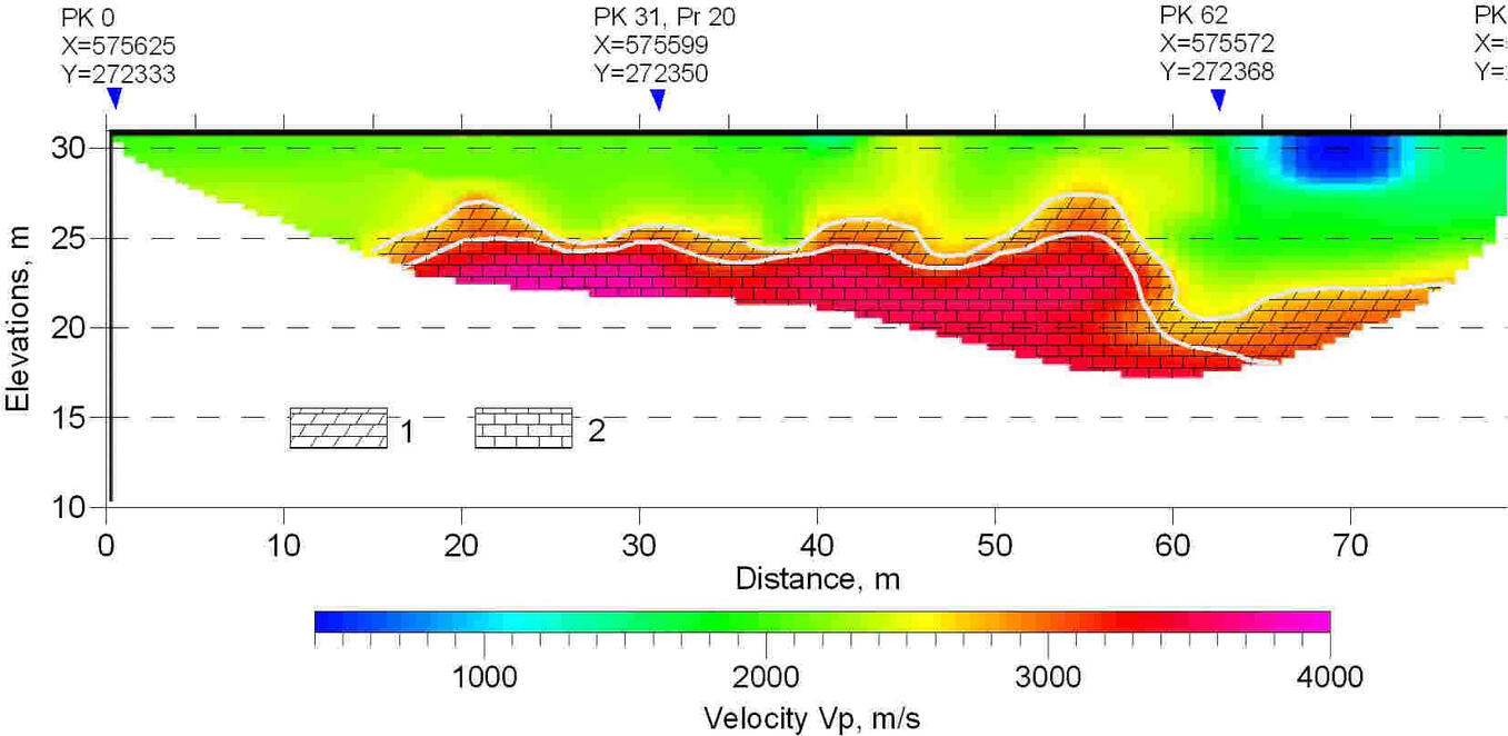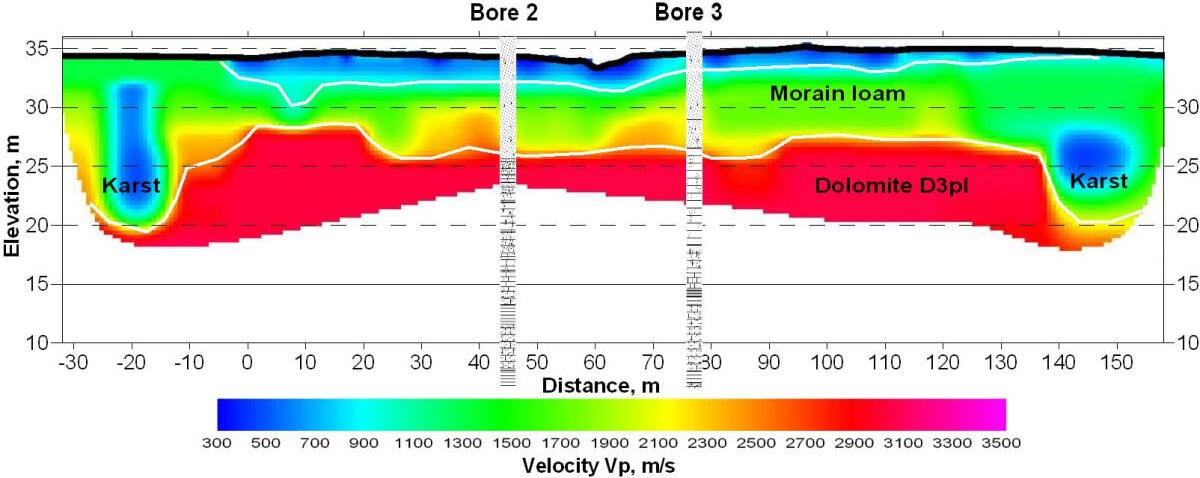 Attēlā parādīts garenviļņu ātruma vertikālā griezuma piemērs pa profilu, kas iet cauri diviem ģeotehniskajiem urbumiem, no kuriem viens atrodas paātrinātas zemes virsmas iegrimšanas zonā virs ūdens aizsprostotas raktuves atveres sāls slaņā.