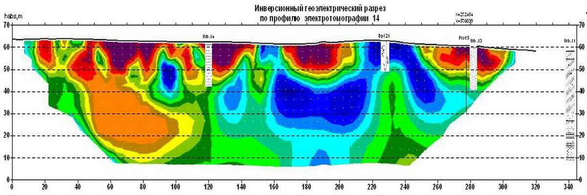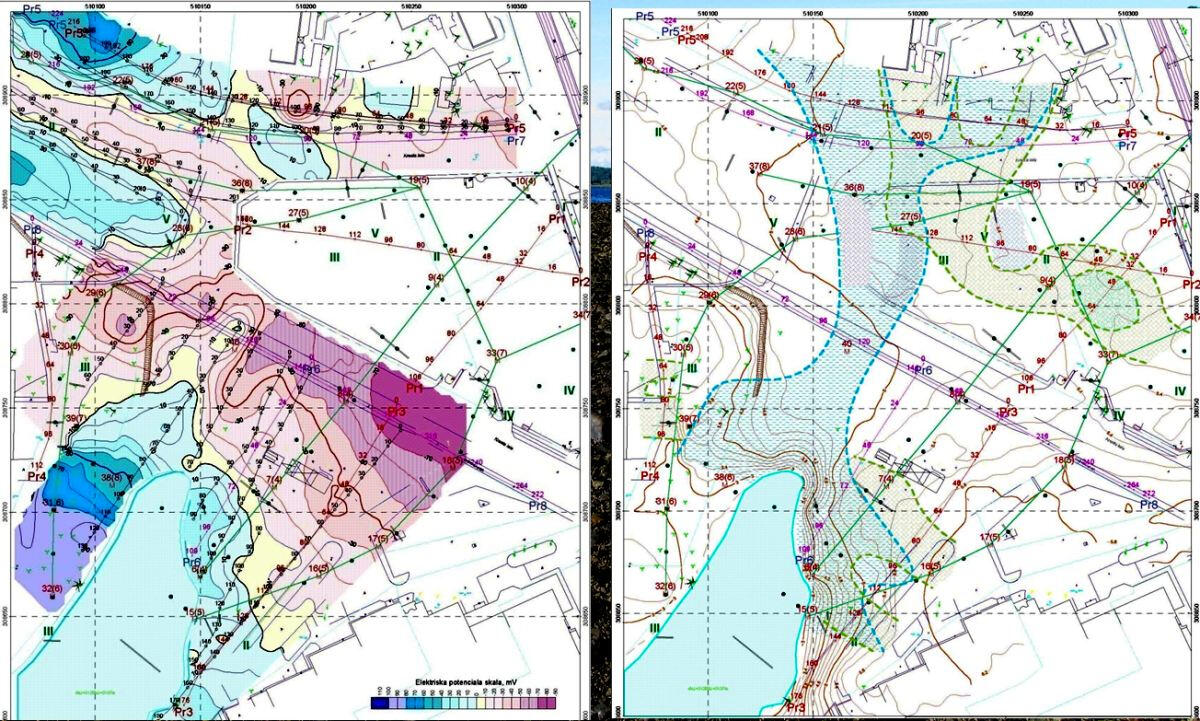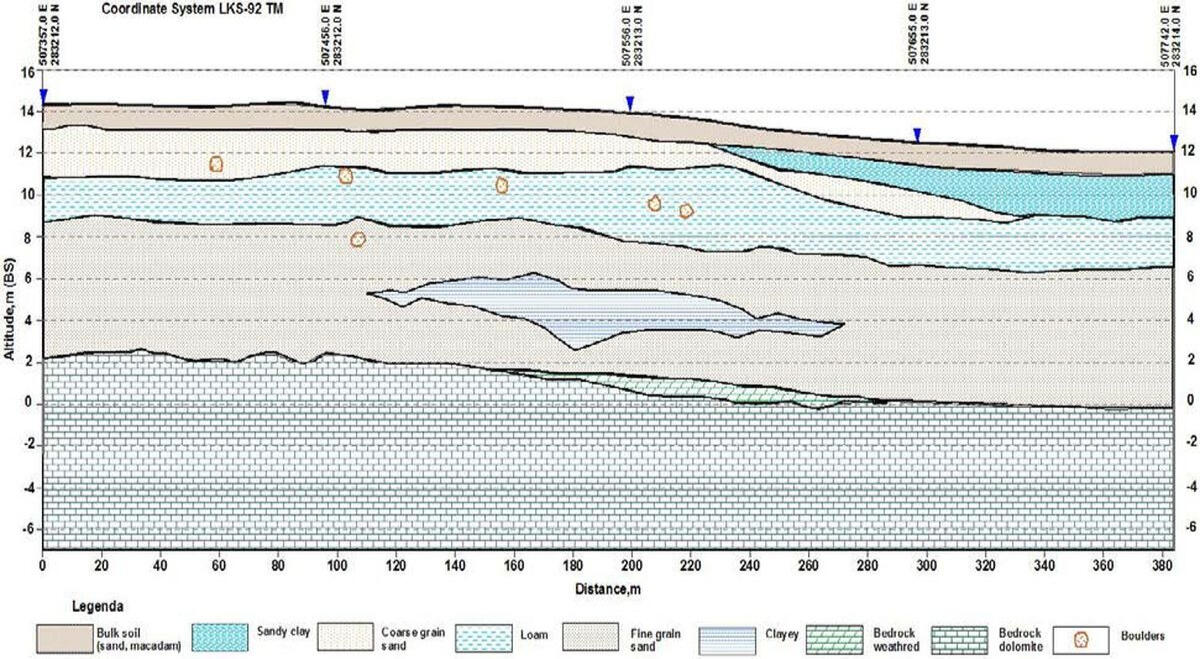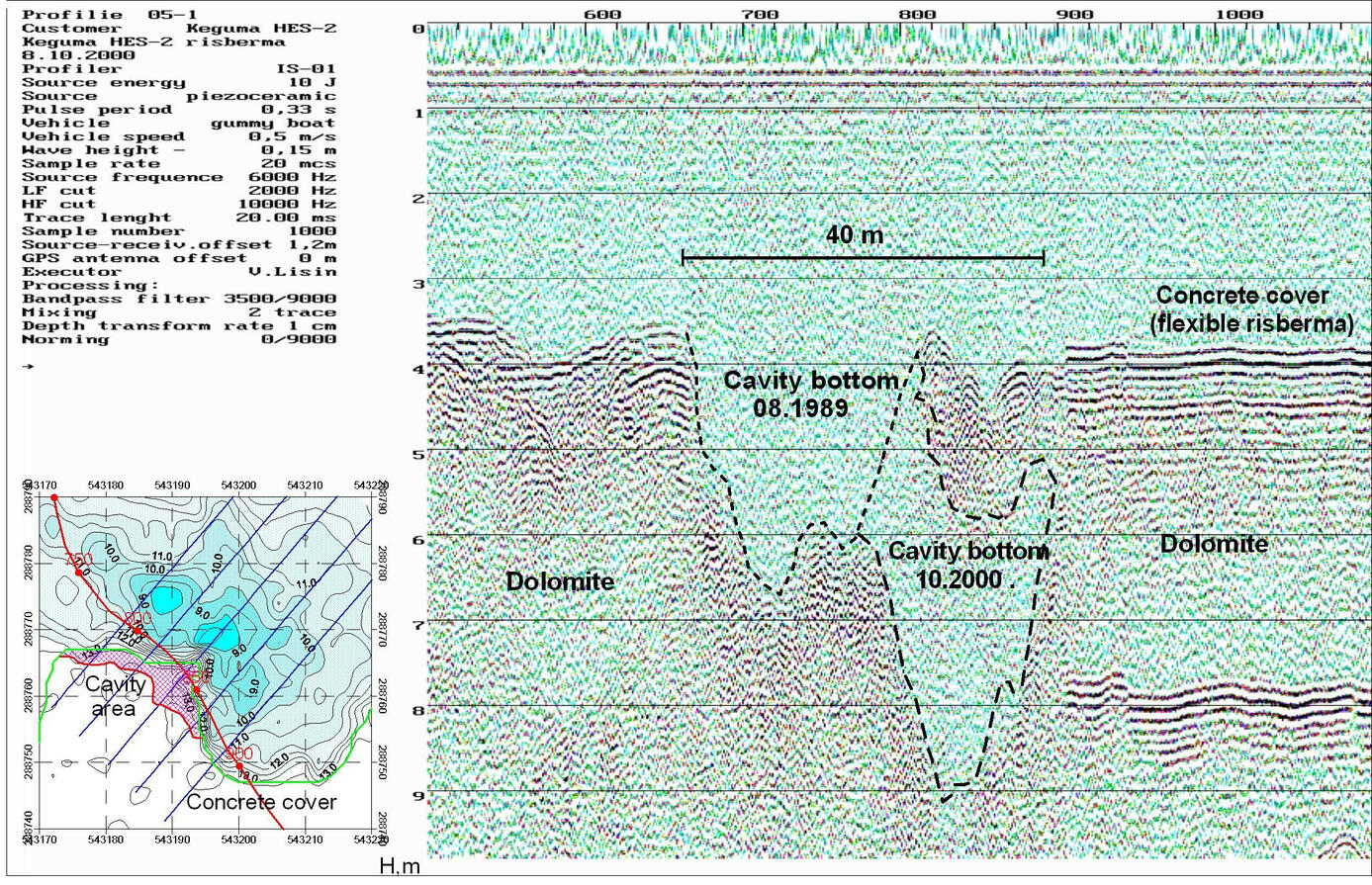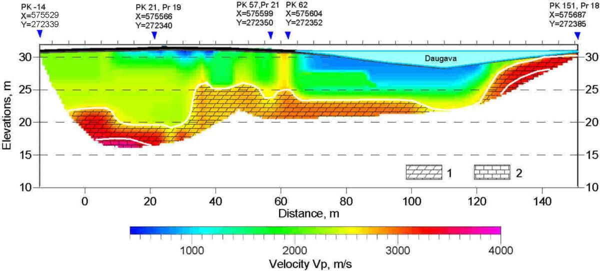 Augšpusē ir griezums ar augstas pretestības sausu smilšu slāni HES apakšstacijas apgabalā, kas pārklāj ar ūdeni piesātinātu morēnas smilšmālu biezumu plānotā rezerves pārgāznes vidusdaļā. Apakšā ir griezums ar mitru aluviālo smilšu un morēna smilšmāla slāni, kas atrodas uz pamatiežu dolomītiem proektēta krītgultnes akas posmā aizsprosta apakšējā bjefā. Šajā griezumā tiek izstrādātas aktīva un aprakta karsta izpausmes, kuras var redzēt šķietamās pretestības griezumā tās zemāko vērtību sadaļu formā, kā arī ātruma Vp un Vs griezumos saskaņā ar šeit veiktajiem seismisko pētījumu datiem. Urbjot ģeotehniskos urbumus, tika konstatēts, ka pie morēnas un pamatiežu virsmas robežas ir dēdētie dolomīti un dolomīta milti.