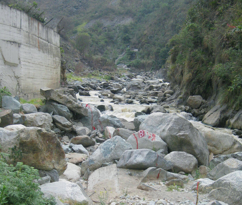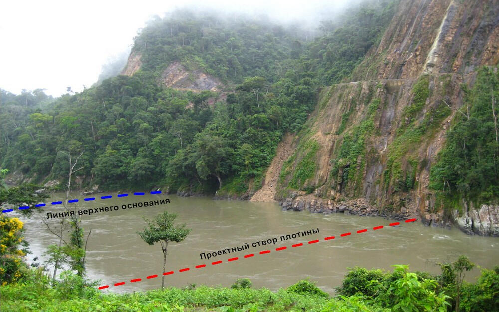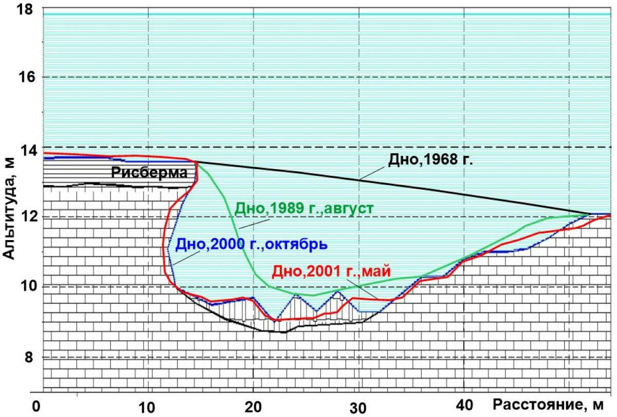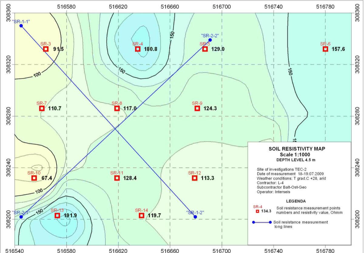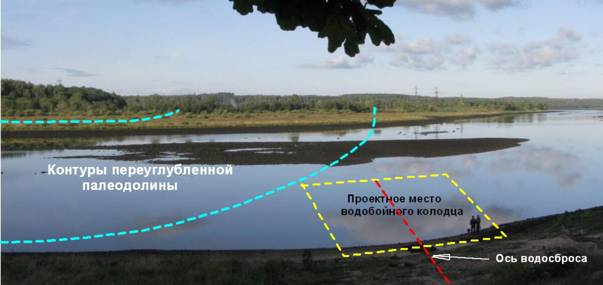 Augšpusē ir griezums ar augstas pretestības sausu smilšu slāni HES apakšstacijas apgabalā, kas pārklāj ar ūdeni piesātinātu morēnas smilšmālu biezumu plānotā rezerves pārgāznes vidusdaļā. Apakšā ir griezums ar mitru aluviālo smilšu un morēna smilšmāla slāni, kas atrodas uz pamatiežu dolomītiem proektēta krītgultnes akas posmā aizsprosta apakšējā bjefā. Šajā griezumā tiek izstrādātas aktīva un aprakta karsta izpausmes, kuras var redzēt šķietamās pretestības griezumā tās zemāko vērtību sadaļu formā, kā arī ātruma Vp un Vs griezumos saskaņā ar šeit veiktajiem seismisko pētījumu datiem. Urbjot ģeotehniskos urbumus, tika konstatēts, ka pie morēnas un pamatiežu virsmas robežas ir dēdētie dolomīti un dolomīta milti.