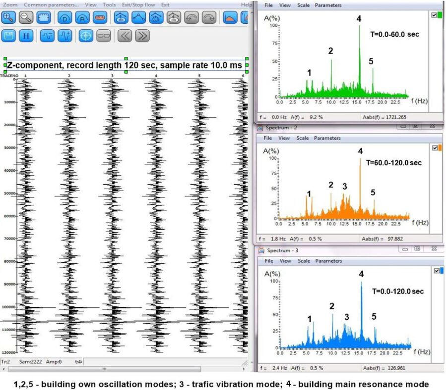 Svarīgs faktors konstrukcijas vibrācijas pretestībā ir tās pašas rezonanses frekvenču un dominējošo vibrācijas frekvenču attiecība, kas izplatās pamatnes masā. Vibrāciju mērījumus veic ar trīskomponentu pārvietojuma sensoriem vai akselerometriem pasīvā režīmā. Diezgan ilgos laika periodos (minūtēs, desmitos minūtēs) iegūto ierakstu spektrālā analīze dažādās ēkas vai projekta būvlaukuma daļās ļauj identificēt dažādu vibrācijas veidu maksimālās frekvences un to avotus (mikrozeisms, transporta troksnis, vibrācijas). darbības mehānismiem).