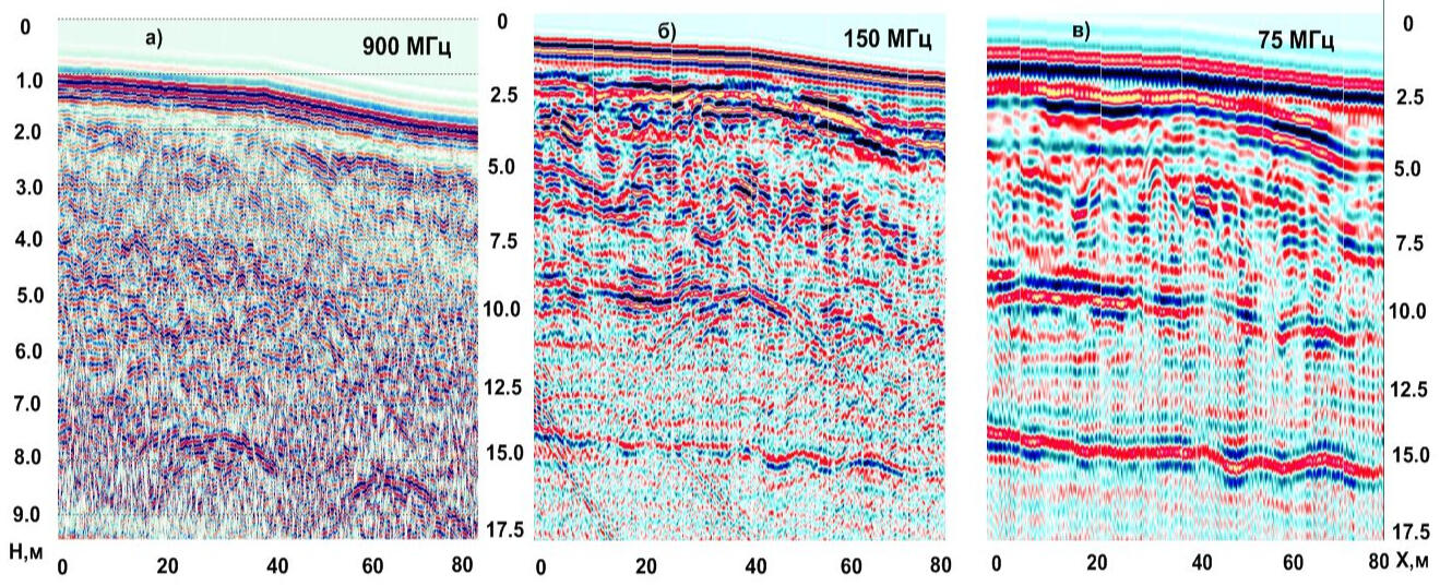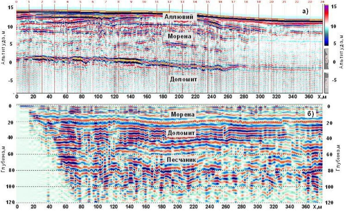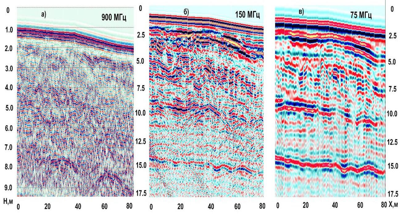 Morēnas un aluviālajos nogulumu pētījumos ģeoradara metode ir ļoti efektīva, lai izpētītu irdenas smilšainas augsnes masīva augšējās daļas struktūru un pamatiežu virsmu. Ar dziļu gruntsūdens galdu dipola zemfrekvences antenu izmantošana ļauj sasniegt 15-20 m dziļumu, izsekot augsnes masīva slāņu robežām un pamatiežu virsmas iezīmēm. Attēlā parādīti radaru griezumu (900–150–75 MHz) piemēri, detalizēti nosakot morēnas augsnes struktūru virs pamatiežu virsmas un tas ir efektīvs atstaroto viļņu seismiskās metodes papildinājums. 900 MHz augstfrekvences ekranētās antenas izmantošanas iespējas šajos nolūkos ir ievērojami ierobežotas, jo impulsa iespiešanās dziļums parasti nepārsniedz 3-4 m, pat sausās smilšainās augsnēs.