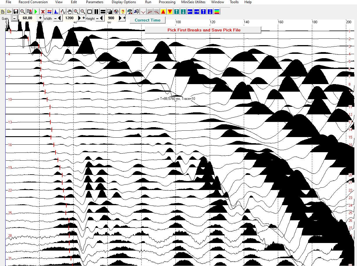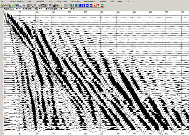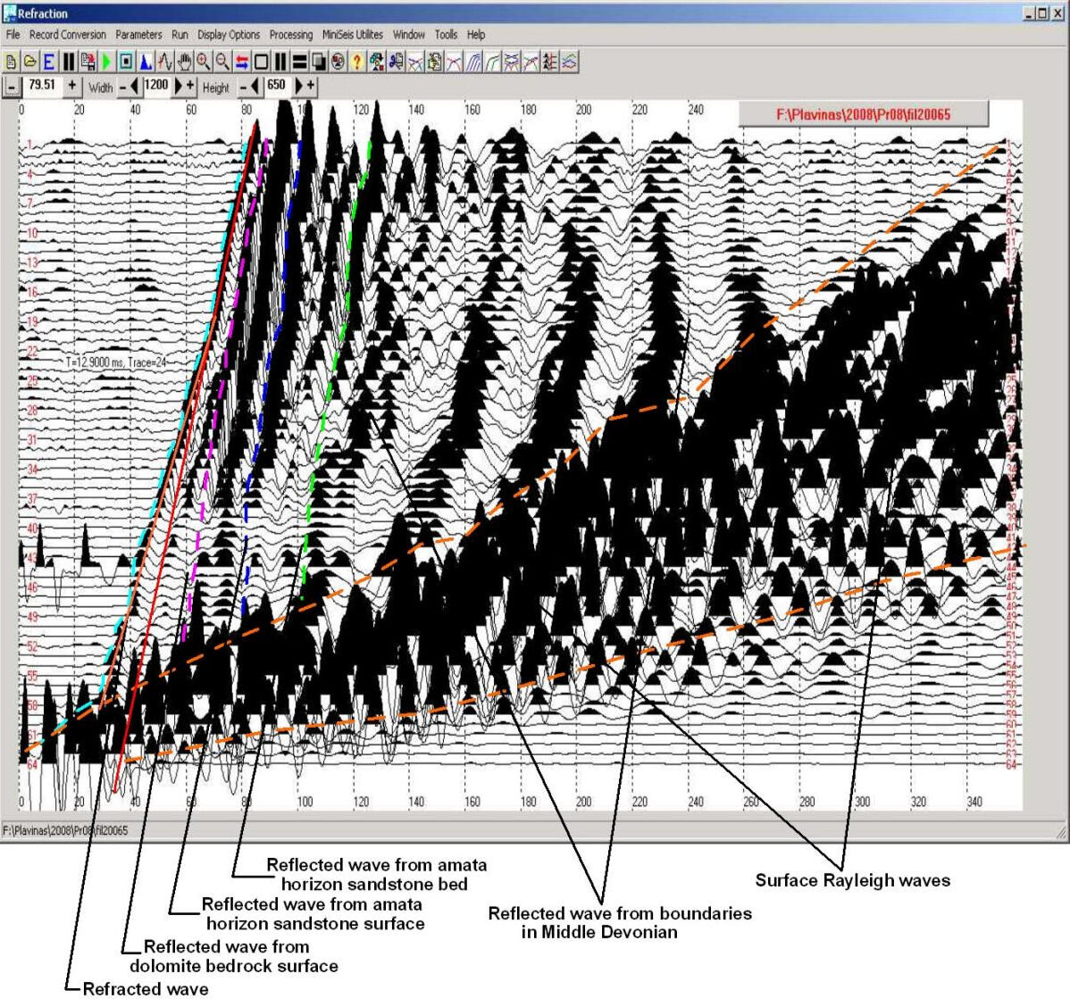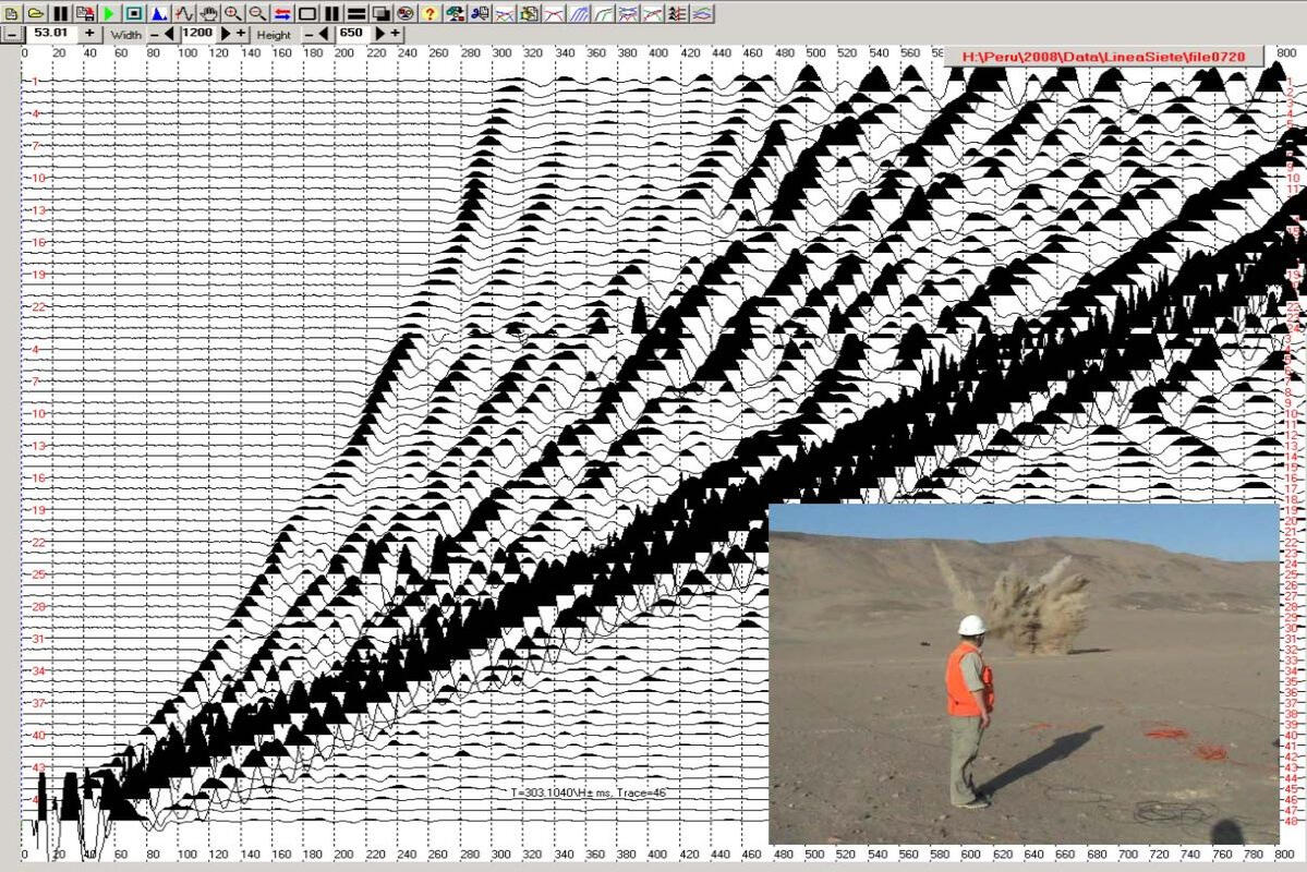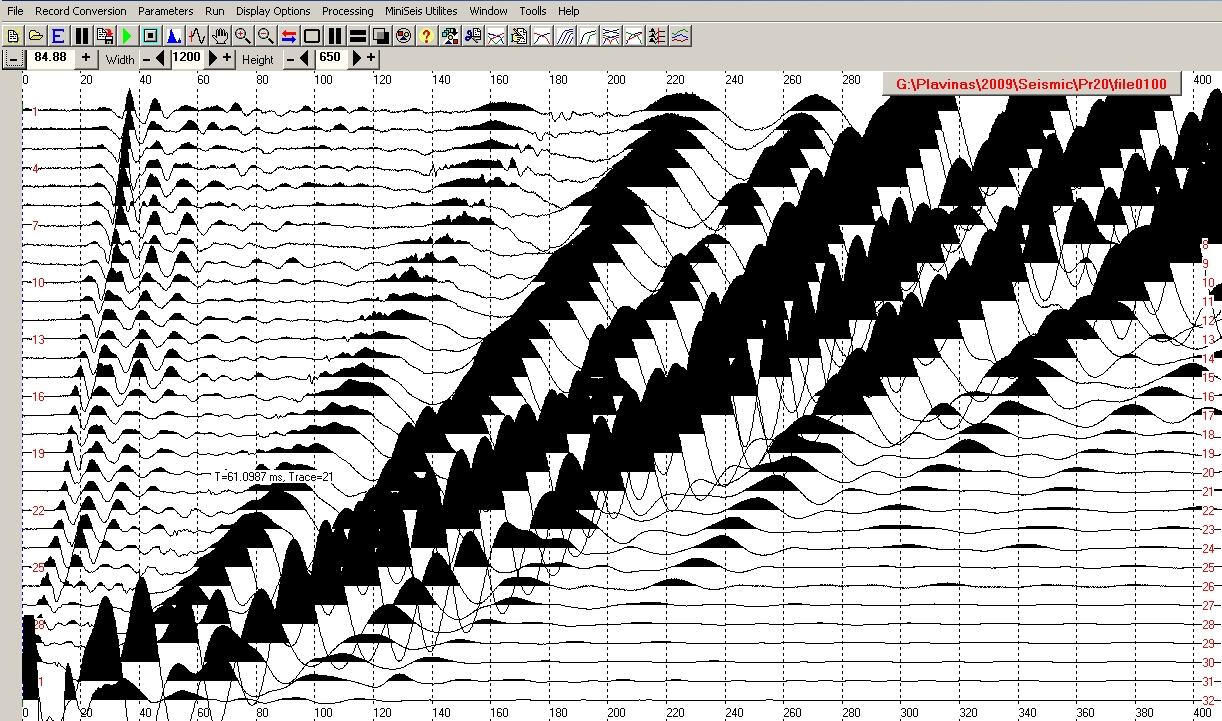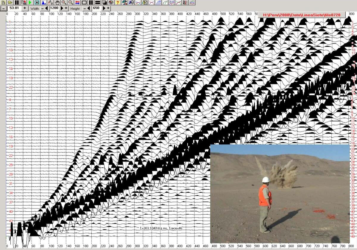 Refraģēto viļņu ieraksts (piemērs), kas iegūts izraisot 3 kg ammonita sprādzienu Čoklon II (Peru) posmā. Bāzes garums 360m, kanālu solis 5m, reģistrators IS128-03.
