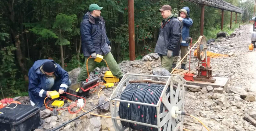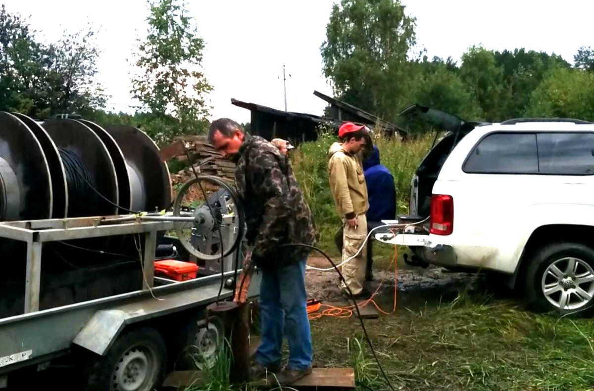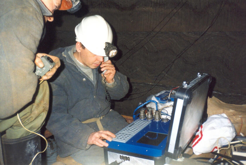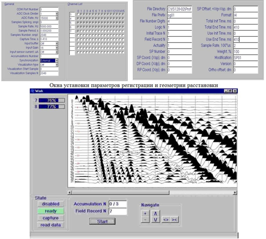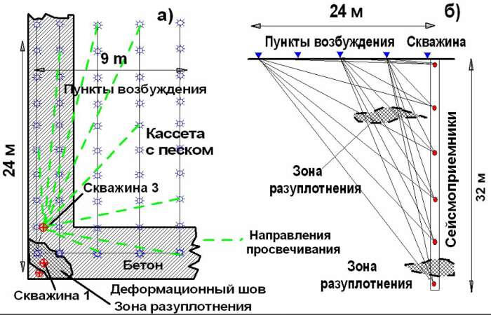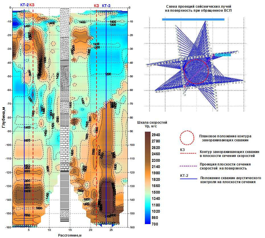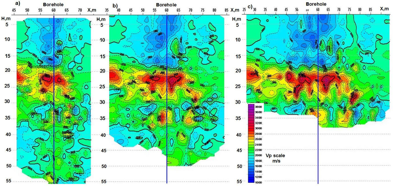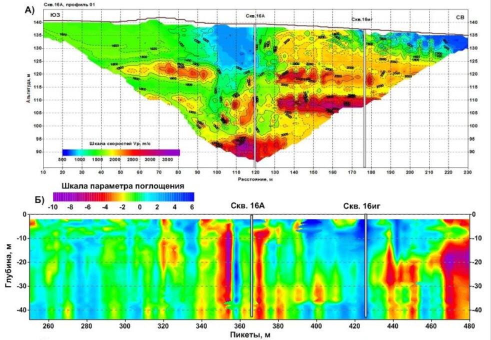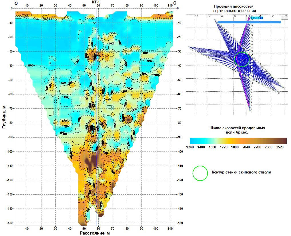 Zemāk redzamo seismisko ierakstu apstrāde un tomogrāfisko griezumu aprēķins tika veikts, izmantojot materiālus, kas iegūti Krievijas Zinātņu akadēmijas (Permas) Urālu filiāles Kalnrūpniecības institūta Aktīvās seismiskās akustikas nodaļā.Izmantojot elektriskās dzirksteles avotu, kura uzkrātā lādiņa enerģija ir aptuveni 1000 J, ir iespējams droši ierakstīt signālus akās attālumā līdz 100 metriem vai vairāk. Tajā pašā laikā signāla augstfrekvences komponentu vājināšanās dēļ augsnēs izstarotā signāla spektra centrālā darbības frekvenču josla 1000–1600 Hz sašaurinās līdz 100–400 Hz.Pārraide tiek veikta, savstarpēji aizstājot emitētāju un uztvērēju atrašanās vietu divās akās. Novērojumi tika veikti, izmantojot dažādas enerģijas - 600 un 1000 J, un attiecīgi ar dažādām izstaroto impulsu centrālajām frekvencēm. Neskatoties uz to, pretskenēšanas laikā tika iegūta augsta tomogrāfisko attēlu konverģence gan ātruma absolūtajās vērtībās, gan lokālā ātruma anomāliju vietā. Tas ļauj secināt, ka griezumā noteiktās zemā ātruma anomālās zonas pietiekami atspoguļo grunts un pamatiežu strukturālās īpašības un fizikālās īpašības caurspīdīgajā apgabalā.