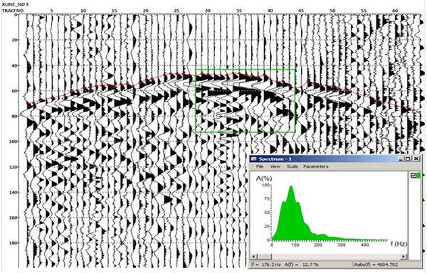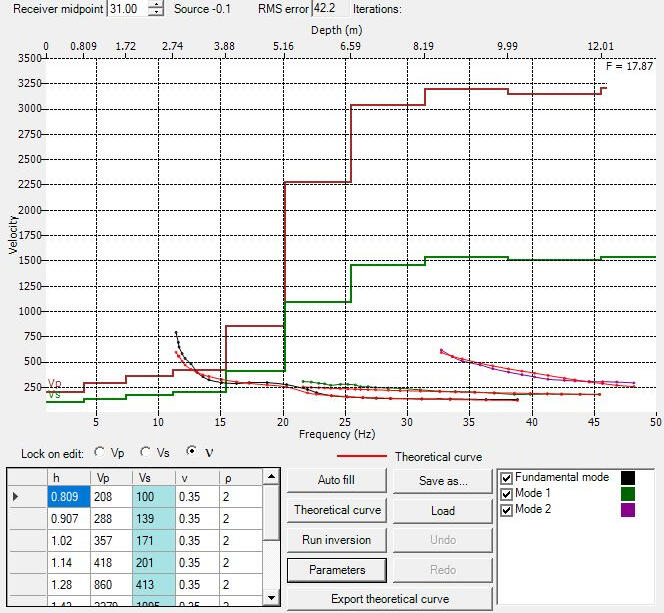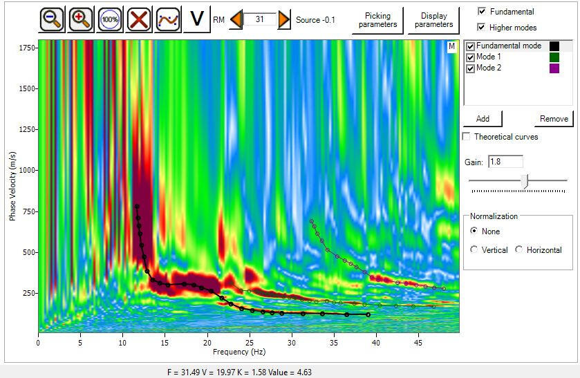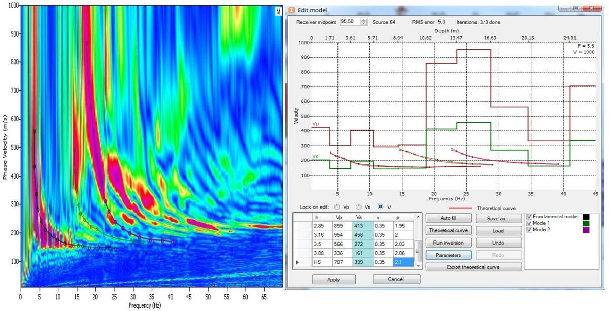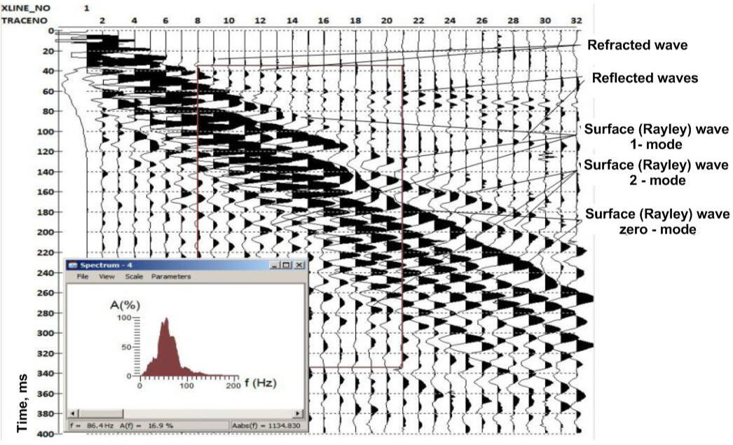 Galvenie daudzkanālu frekvences analīzes priekšnoteikumi ir šķērsvirziena pārvietojuma komponenta enerģijas pārsvars svārstību izplatīšanās laikā gar interfeisu un fāzes ātrumu frekvences dispersija - redzamā perioda palielināšanās un attiecīgi virsmas viļņu enerģijas iespiešanās dziļuma palielināšanās augsnes masīvā ar pieaugumu šķērsvirziena pārvietojumu izplatīšanās ātrumā. Pa kreisi parādīta fāzes ātruma matrica vairākām virsmas Releja viļņa harmonikām, kas raksturo fāzu ātrumu spēcīgu frekvences dispersiju. Bīdes viļņa ātruma modeļa aprēķināšanā tika izmantotas virsmas viļņa nulles, pirmās un otrās harmonikas dispersijas līknes.Iepriekš minētie virszmas viļņu daudzkanālu analīzes rezultāti tika iegūti, izmantojot programmatūras paketi RadExPro (Deco-ģeofizika, Maskava).