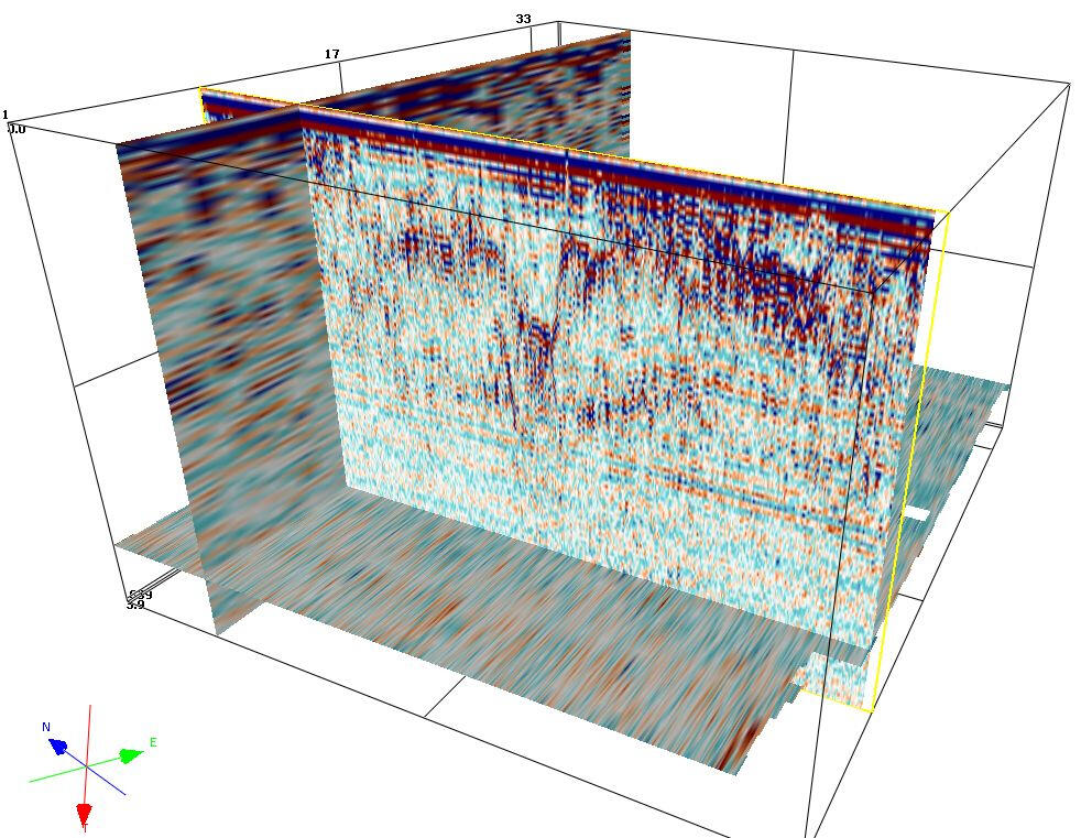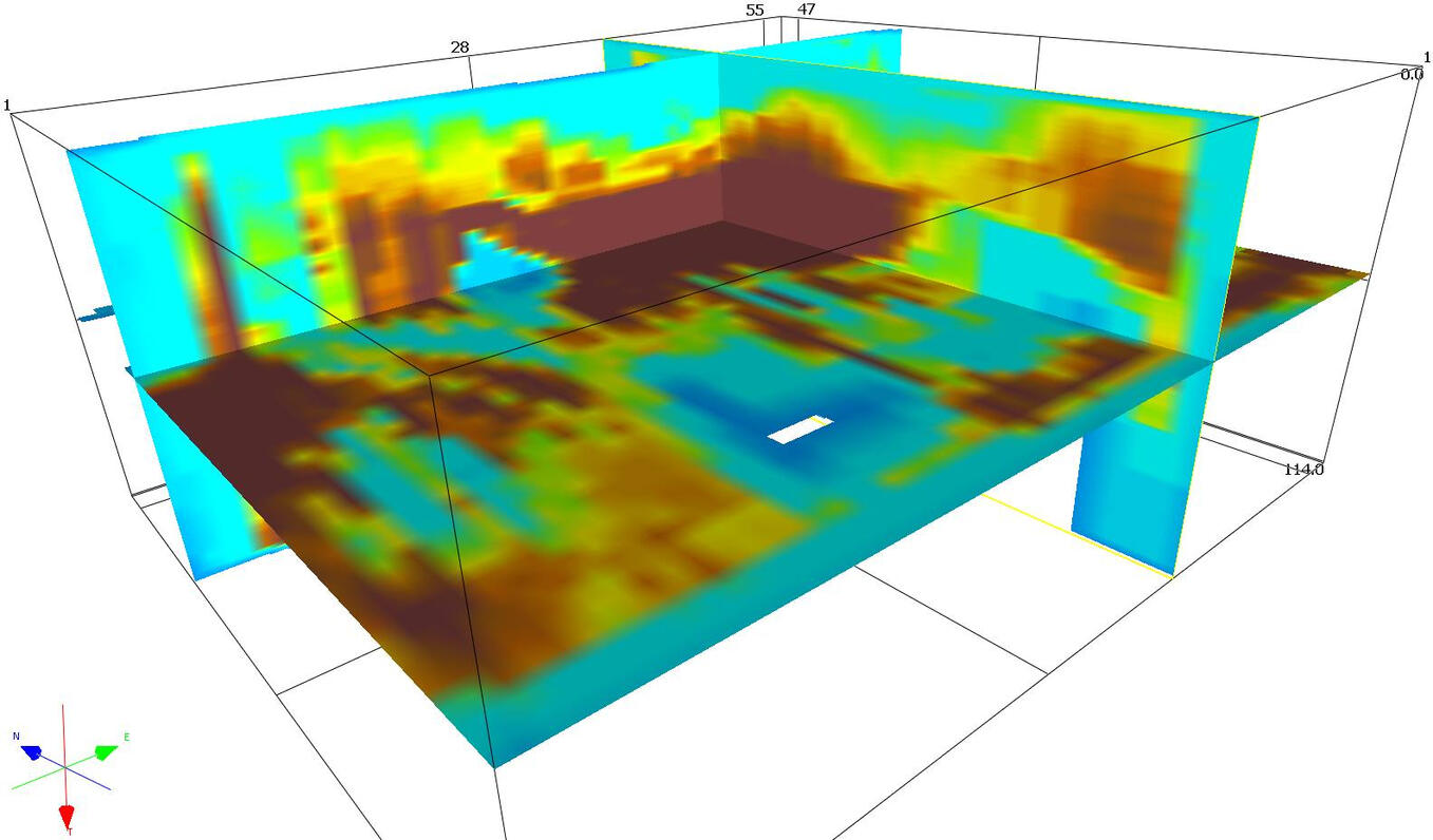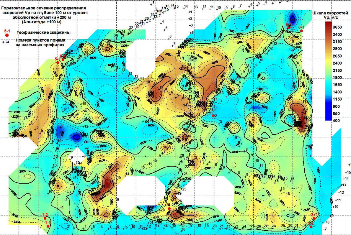 Apstrādājot iegūto datu masīvu no novērojumu profilu kopas uz virsmas, tiek savākts telpisks 3-dimensiju koordinētu ātruma vērtību paraugs, kas saistīts ar dažādiem seismisko staru segmentiem. Šī parauga datu ģeoloģiskai interpretācijai tiek aprēķināti horizontālie un vertikālie ātruma posmi, kas atspoguļo augsnes masiva un pamatiežu lokālās neviendabības.Apkopošanas paraugs visām urbumiem daudzstūrī ir telpiska punktu kopa ar ātruma vērtībām, kas ir līdzīga ātruma kubam, kas iegūts, apstrādājot parāstos 3D seismiskos datus. Sekojošā ātruma sadalījuma analīze masīvā tiek veikta, izmantojot iegūtā telpiskā parauga nejauši orientētu vertikālu un horizontālu sekciju sēriju. Šādas horizontālas sekcijas piemērs +110 m absolūtā augstumā (apmēram 90 m dziļumā no virsmas) ir parādīts attēlā pa kreisi.