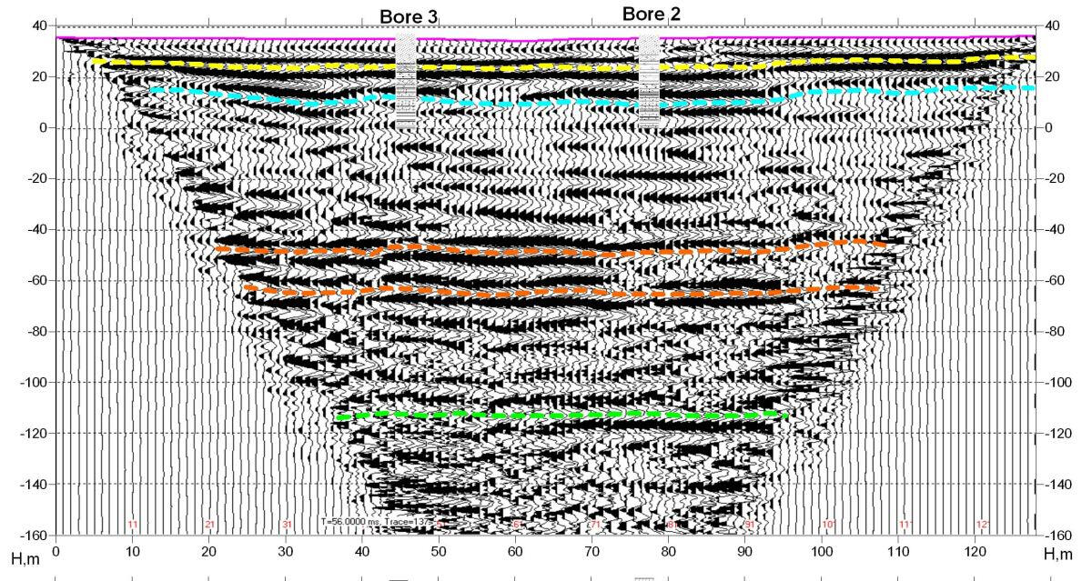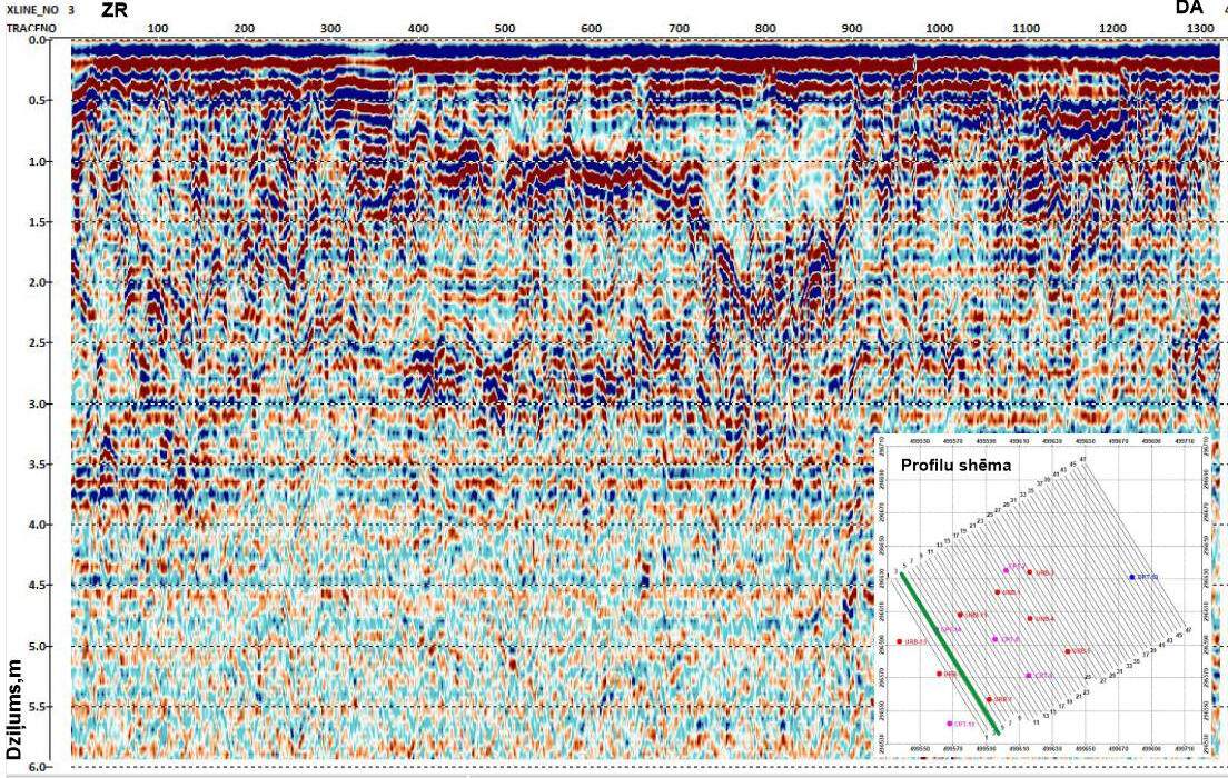 Šajā profilā pamatiežu dolomīta jumts ir skaidri izsekojams 6-8 m dziļumā zem bieza morēnas smilšmāla slāņa. Ielejas sānu daļās atstarojošās robežas tiek izsekotas, kas, iespējams, ir saistītas ar lielo rupju devuālo plūmju nogulsnēm. Šajā piemērā labi izpaužas atšķirības metožu dziļumā. Tādējādi KGP grizumā var izsekot robežu aptuveni 150 m dziļumā, kas, iespējams, ir saistīta ar vaļēju Amatās-Gaujāš smilšakmeņu pamatni, savukārt dziļums ātruma griezumā, iegutā izmantojot refrakcijas viļņu metodi, ir aptuveni 30 m ar uztverošās pamatnes garumu 126 m.Šis griezums tika iegūts, izmantojot āmuru, kura svars ir 6 kg, sakrājot trīs stienus. Uztvērēju solis ir 2 m, ierosmes punktu - 4 m.