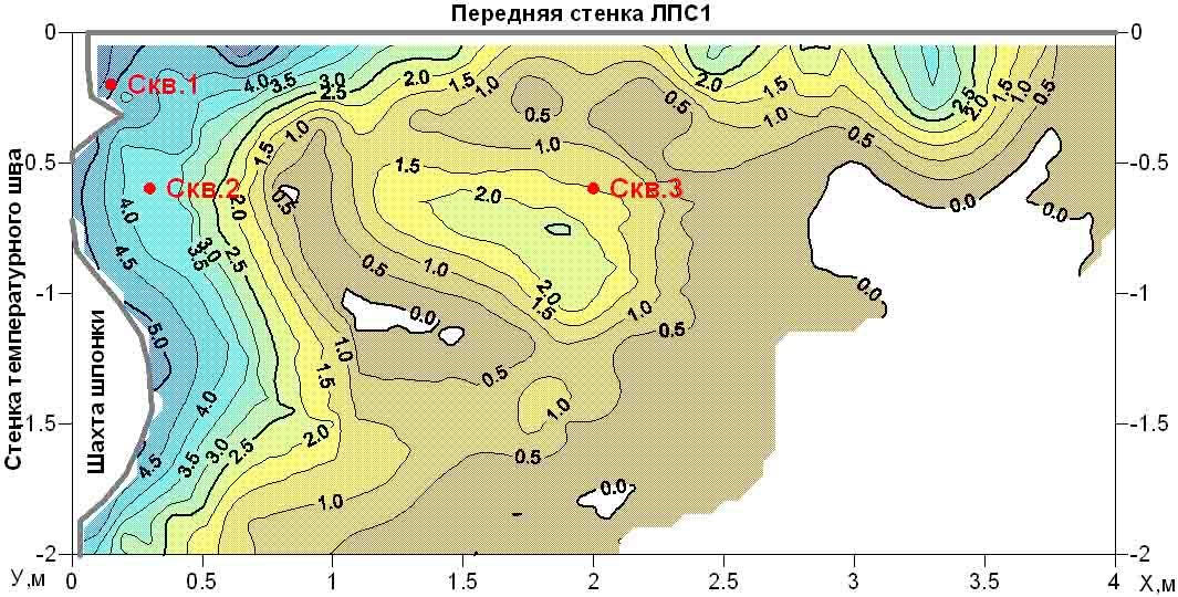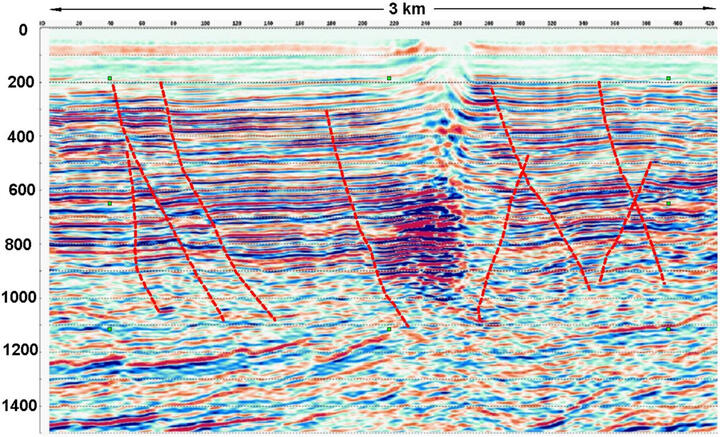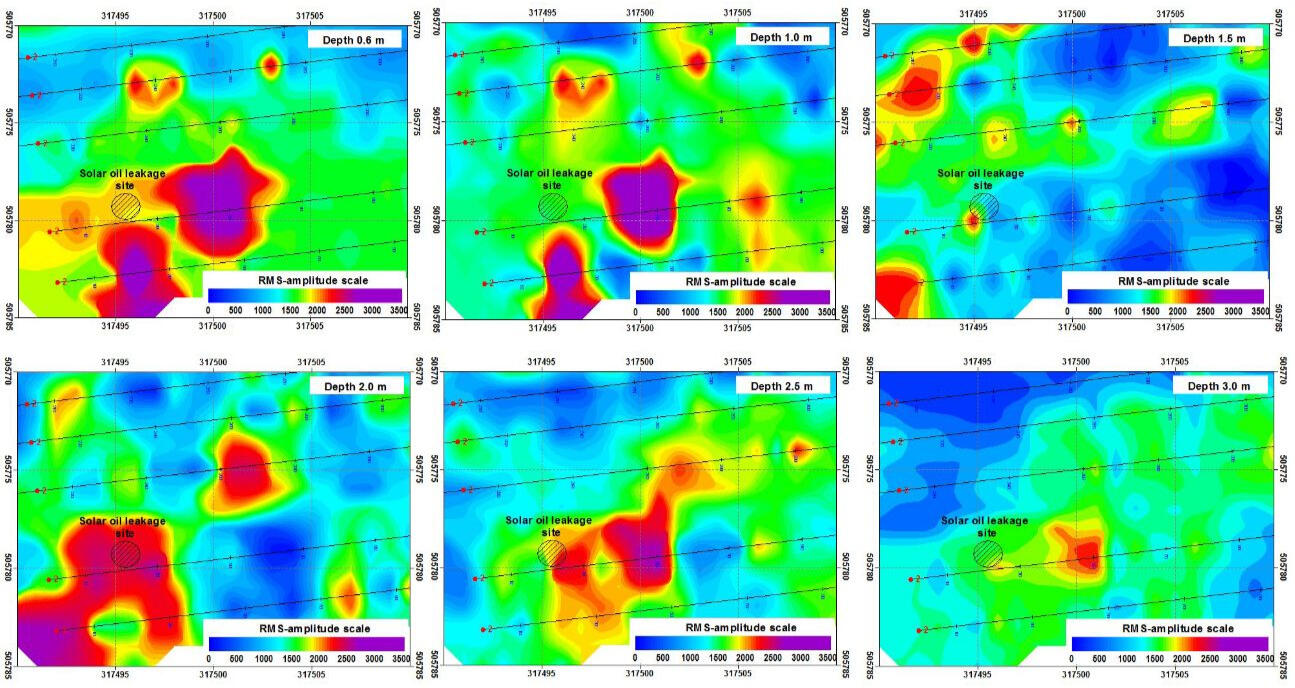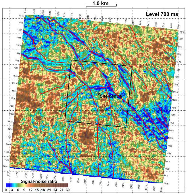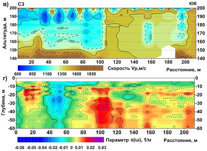 Absorbcijas koeficienta (zilās krāsas) pozitīvās vērtības atbilst apgabaliem ar mazu garenvirziena viļņu ātrumu virszemes grunts kritienā. Nenormāli apgabali ar negatīvām absorbcijas koeficienta vērtībām (sarkanām krāsām) atbilst vietām, kur “barojas” virsmas viļņa “enerģija”, pateicoties refleksijai un izkliedei pie iespējamām klinšu masas vertikālās sašķelšanās un saspiešanas zonu robežām.