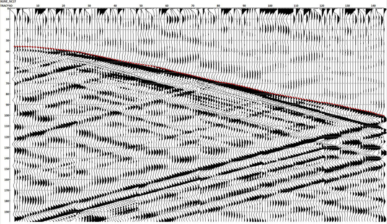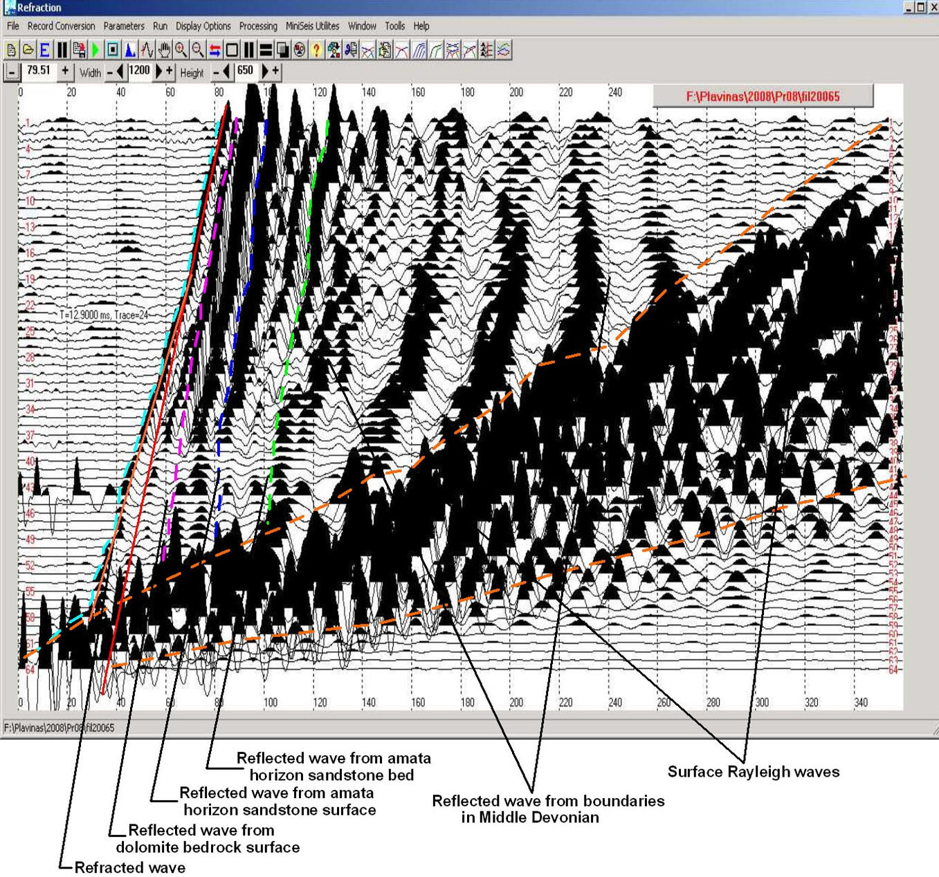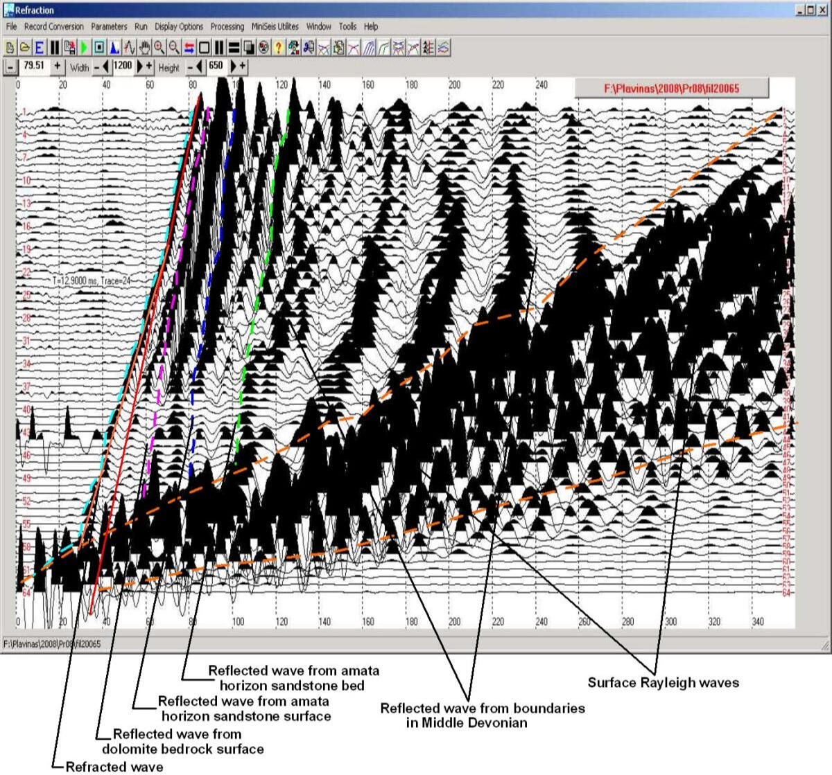 Apstrāde veikta ar SeisOptim programmas palīdzībuViens no visizplatītākajiem refraģēto viļņu metodes pielietojumiem ir karsta zonu noteikšana pamatiežu virsmas slāņos, ko pārstāv halogēna-karbonāta nogulsnes. Šajos gadījumos metodes dziļumu parasti ierobežo ātrgaitas nogulumu jumta dziļums, tomēr pamatiežu izdēdējušās virsmas un pārklājošās augsnes slāņa fizikālo īpašību mainīgums ir diezgan atšķirīgs.