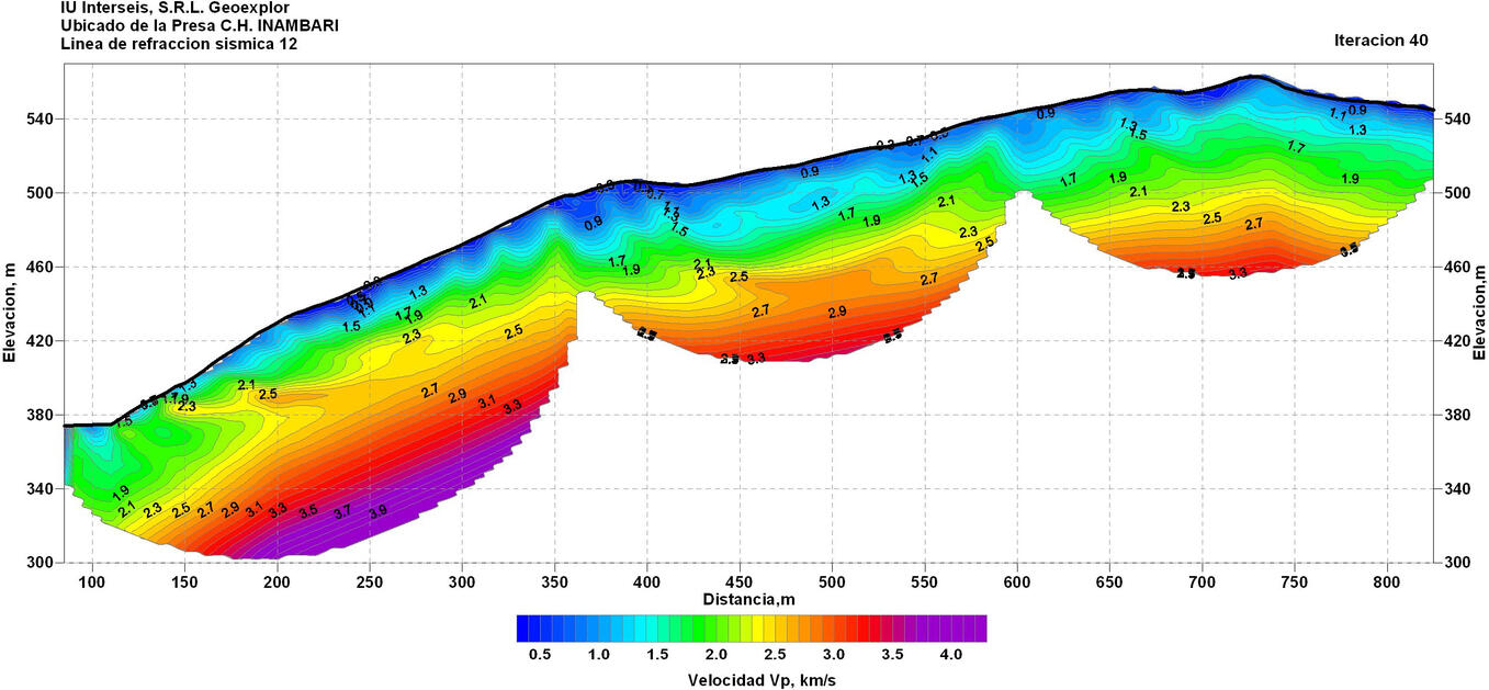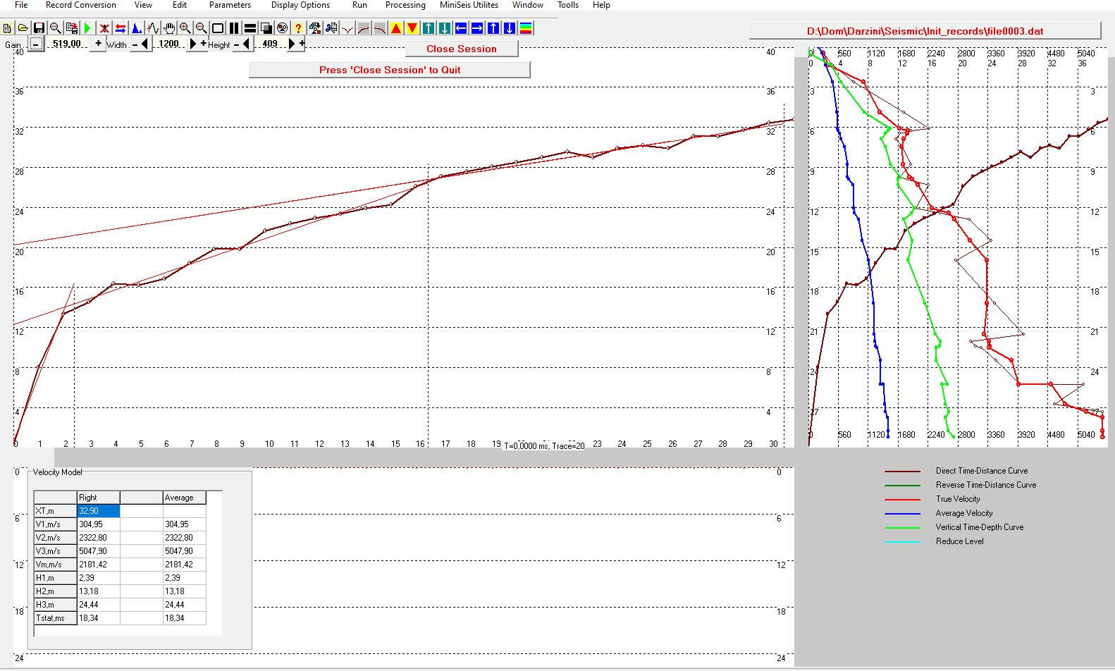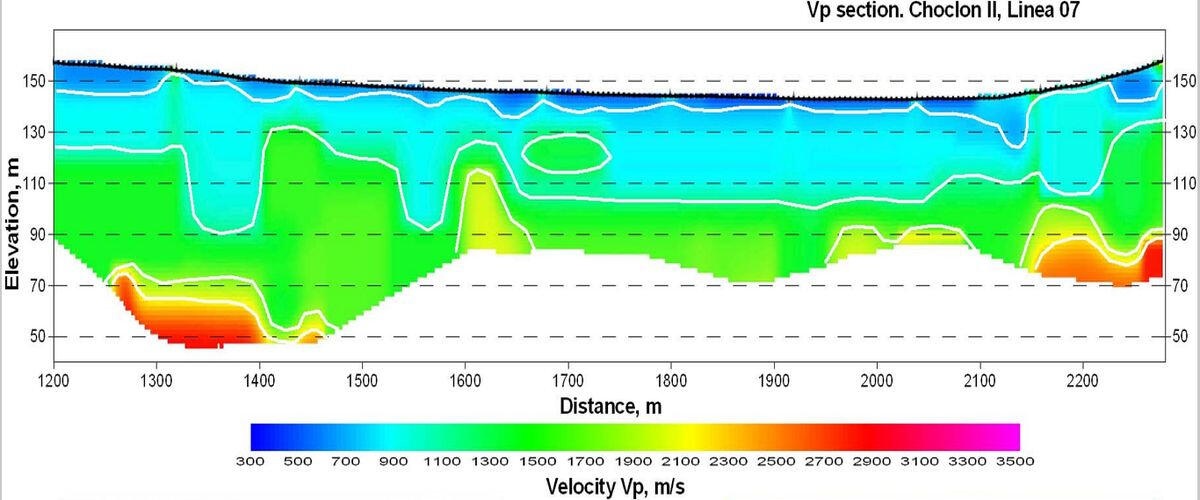 Refraģēto viļņu apstrādes piemērs, lai iegūtu Vp ātrumu, izmantojot programmu SeisOptim vienā no Choclon-2 vietnes profiliem. Pētījums par topošās flotācijas atkritumu glabātavas dibena struktūru metalurģijas rūpnīcā (Peru).