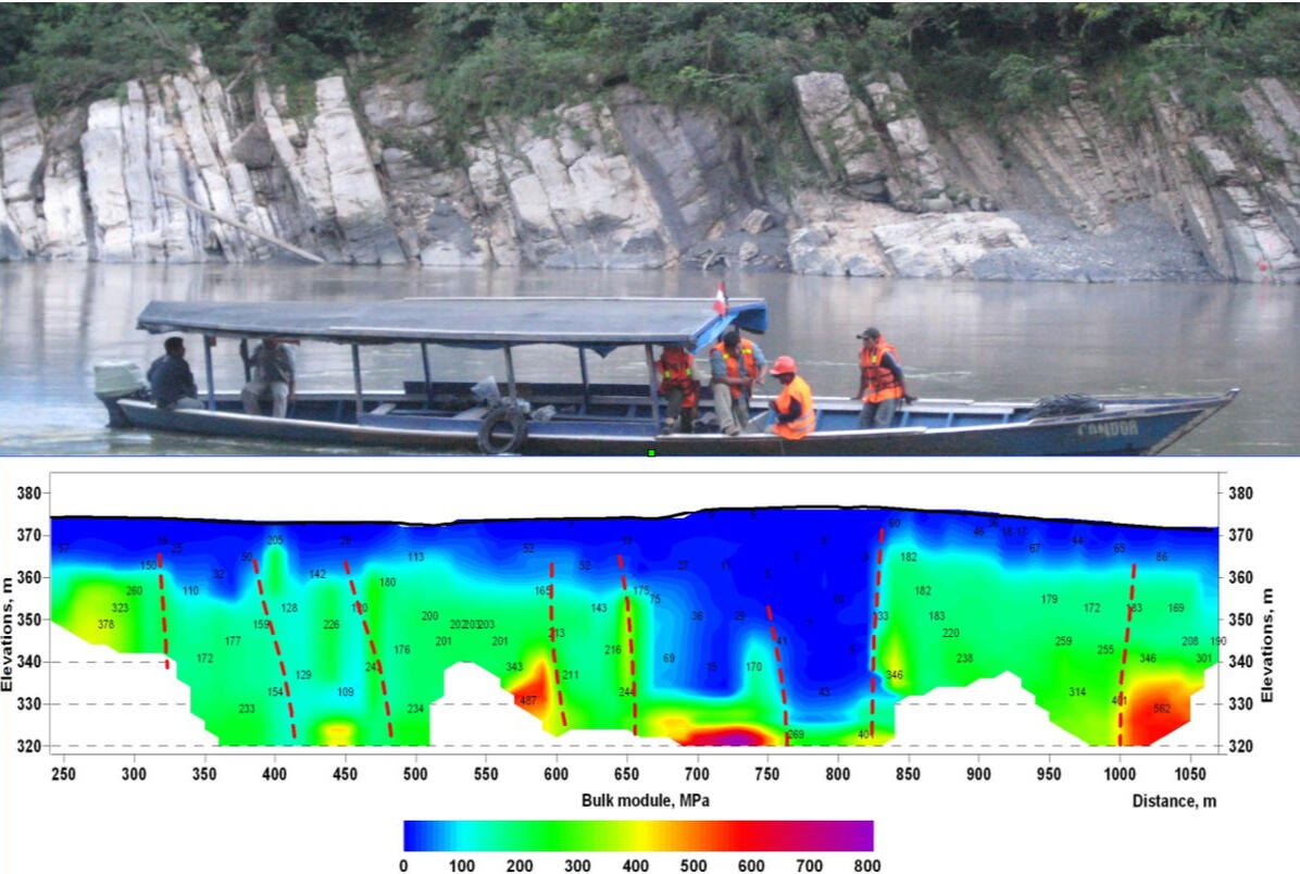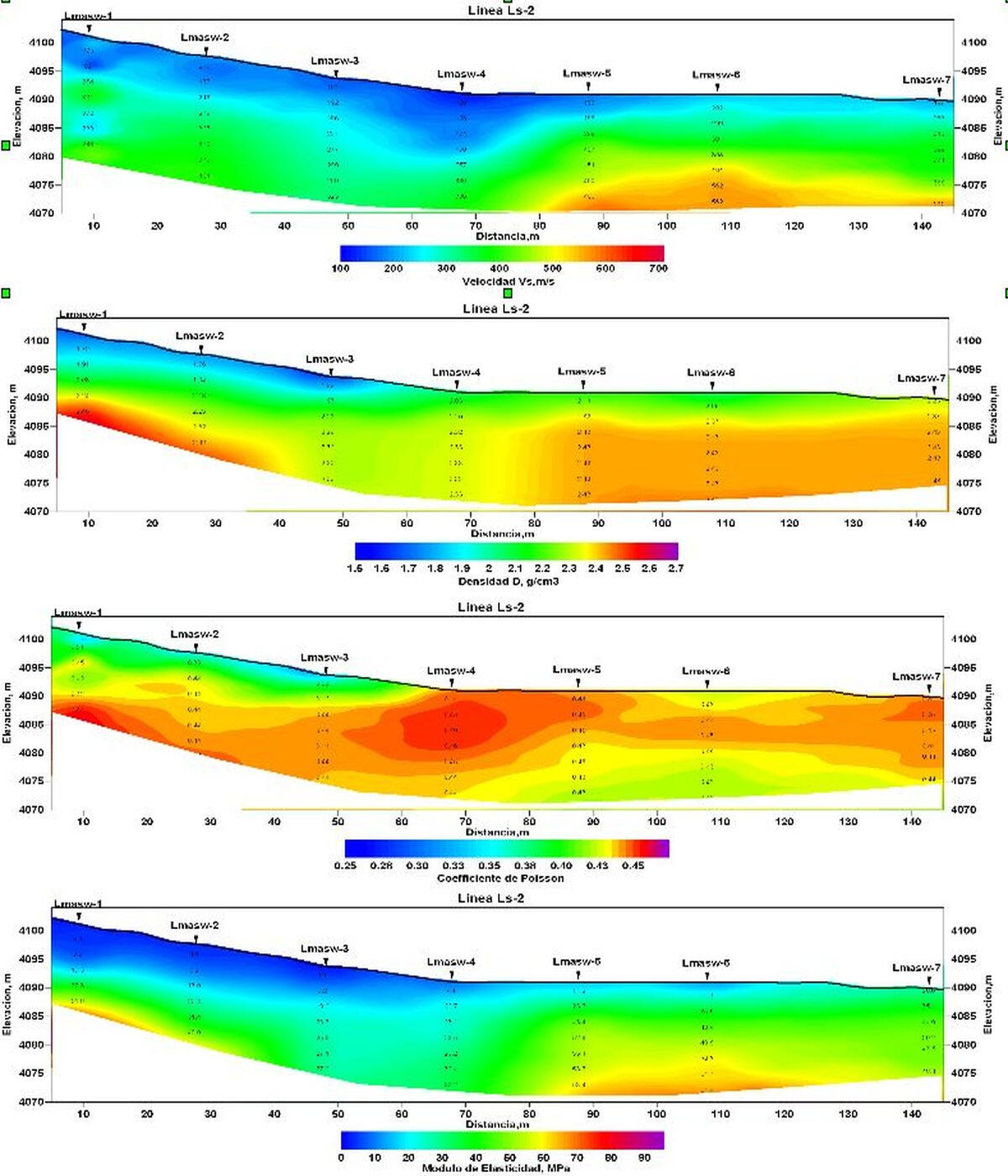 Bīdes viļņu izplatīšanās ātrumu noteikšanas no MASW datiem piemēri un augsnes fizikālo un mehānisko īpašību prognozēšana, izmantojot refraģēto viļņu metodi gar vienu no zelta lauka attīstības virzieniem Peru dienvidos, ir parādīti nākamajā attēlā.Balstoties uz garenisko viļņu izplatīšanās ātrumu griezumiem pie refraģēto un bīdes viļņu pirmajiem ienākšanas punktiem, izmantojot MASW metodi, tiek aprēķināti prognozētā blīvuma pēc garenviļņu ātrumiem, Puasona koeficienta un elastības moduļa griezumi gar zelta atrādnes Čukapaka (departamenta Moquegua, Peru) attīstības profilu.
