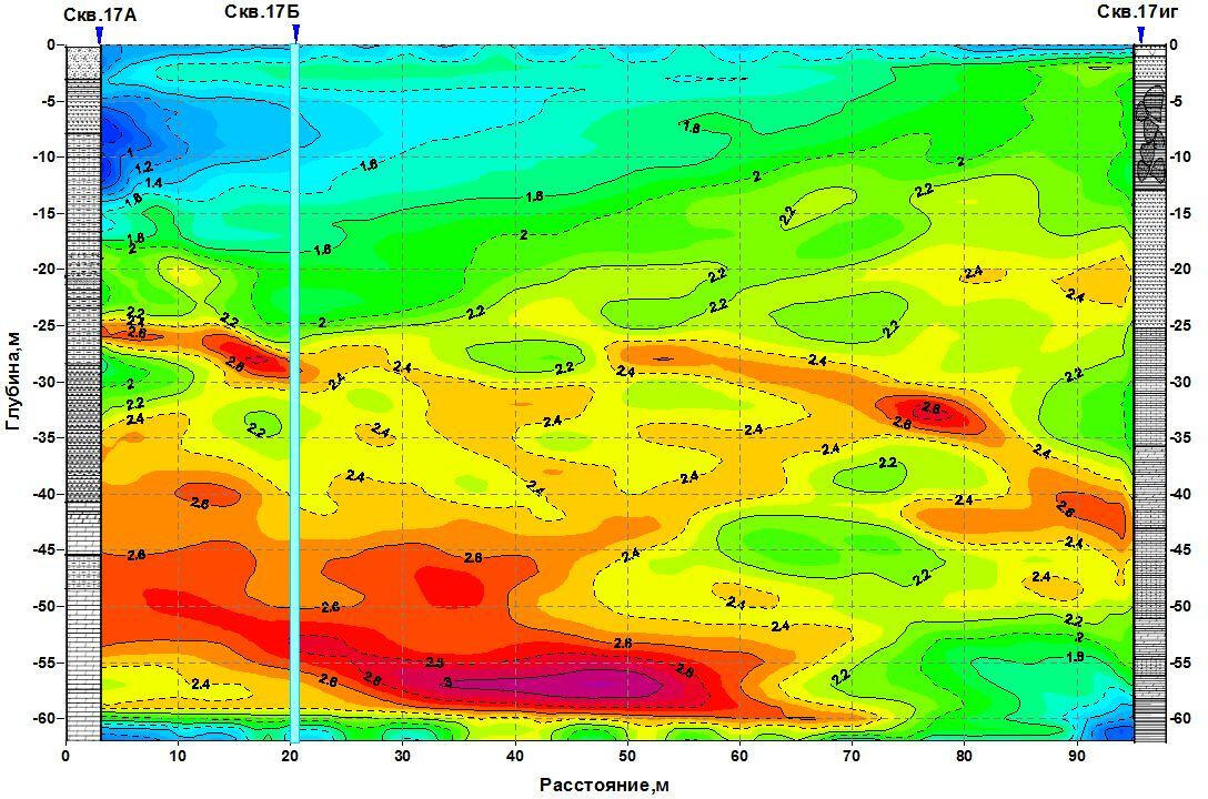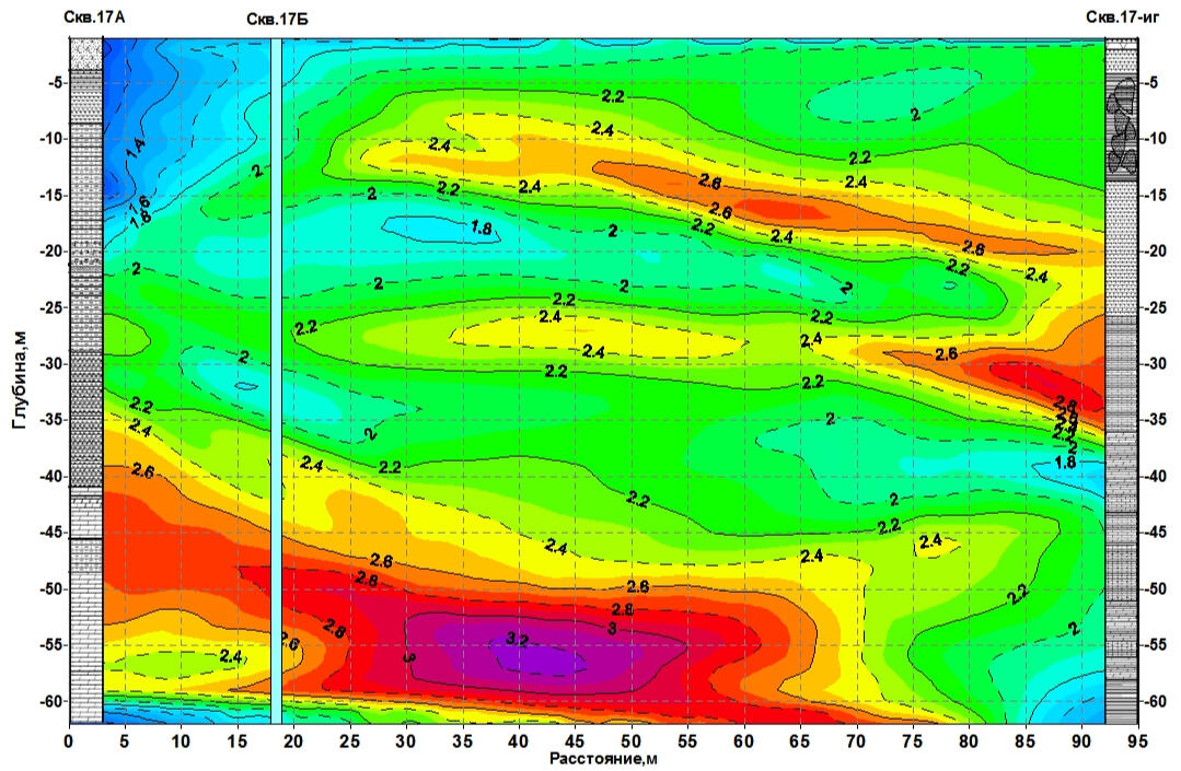 Konsolidēts ātrumu tomogrāfiskais griezums, ko iegūst ar starojumu urbumā 17A un signālu uztveršana urbuma 17B 20 m attālumā un urbumā. 17ig 96 m attālumā.