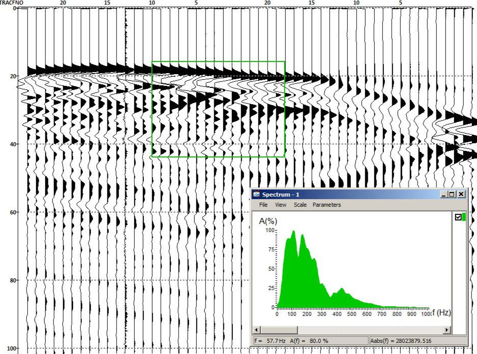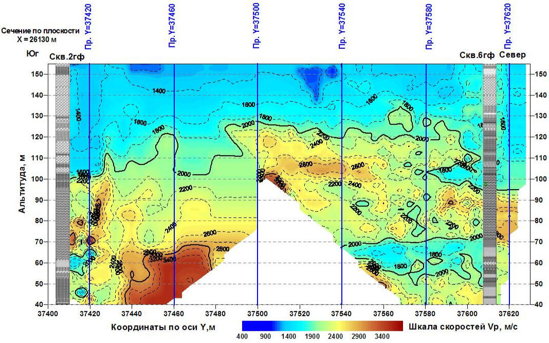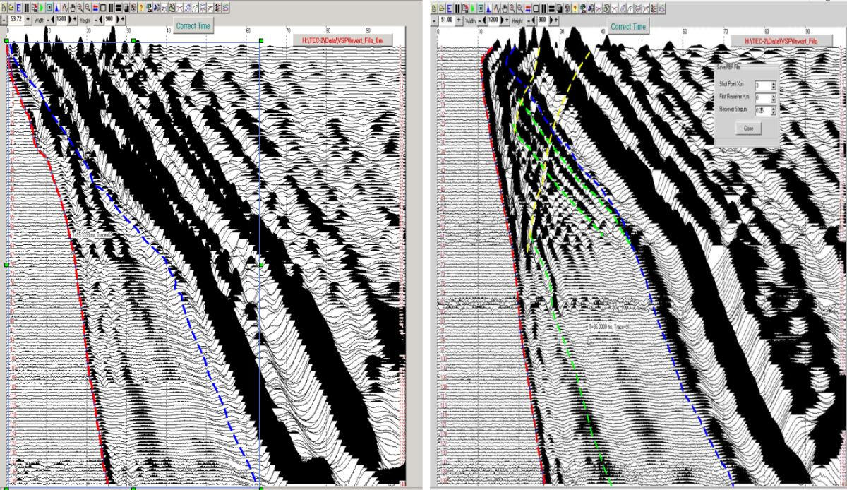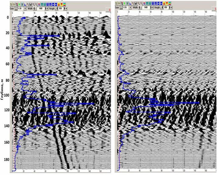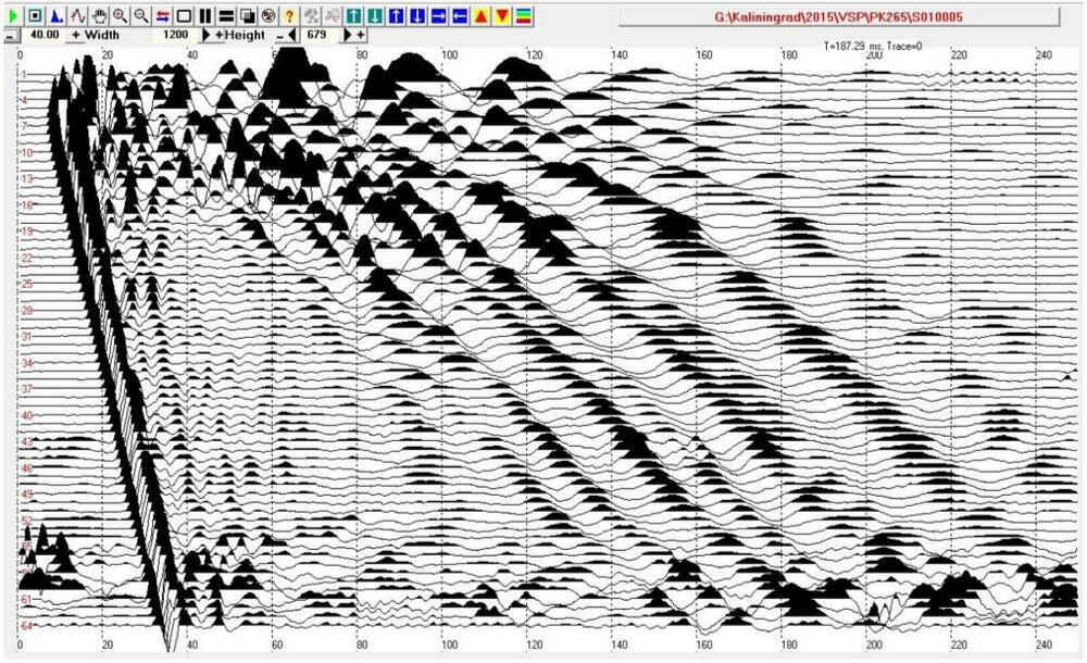 VSP griezums iegūts, reģistrējot vibrācijas urbumā, izmantojot 8 kanālu zondi ar pjezo spiediena sensoriem. Attālums starp uztvērēju ir 1 m, ierosinājumu punkta attālums no urbuma galviņas ir 5 m. Līdz ar pirmajiem krītošā gareniskā viļņa pienākumiem tiek reģistrēts zemas frekvences zema ātruma hidrauliskais vilnis.