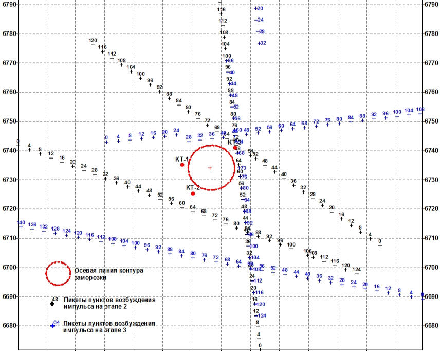 Šajos griezumos virsmas viļņu enerģijas palielināšanas zonas izpaužas, ņemot vērā refleksijas iespējamjā vertikāljā lūzumā un akmeņu masas saspiešanā uz mīnu lauka virsmas paātrinātas nogrimšanas zonas robežās virs izlietotajām pazemes sāls raktuvjēm.