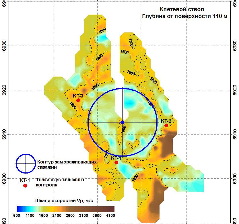 Izmantojot šo novērošanas sistēmu, ir iespējams iegūt elastīgo viļņu ātrumu sadalījumu tuvās akas telpā, kurai ir apgrieztas piramīdas forma ar pamatni uz novērošanas virsmas. Tuvojoties akai, pētāmās telpas platības dziļums palielinās, bet tā šķērseniskie izmēri horizontālajā plaknē samazinās.Garenviļņu izplatīšanās ātrumu kubs ir konstruēts, pamatojoties uz telpiski koordinētu aprēķināto ātrumu paraugu plānu slāņu robežās seismisko staru laušanas punktos no virsmas avotiem līdz uztvērējiem akās. Tādējādi tas atspoguļo vispārinātu patieso ātrumu sadalījuma modeli urbuma telpā.Dotās datu kuba sadaļas nav paredzētas izmantošanai nekādās dokumentētās lietojumprogrammās - sadaļās, kartēs utt. To mērķis ir sniegt vizuālu priekšstatu par iespējamo liela ātruma anomāliju lokalizāciju, izmēru un konfigurāciju iežu masīvā pētījumu vietā.