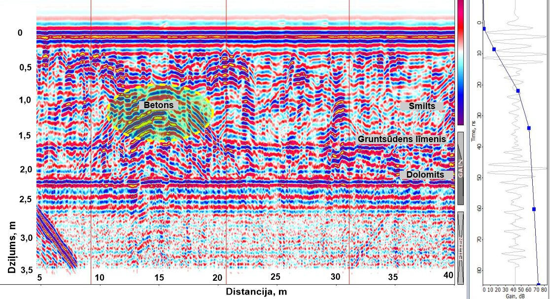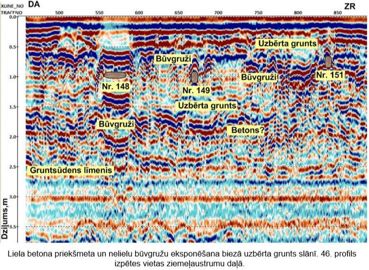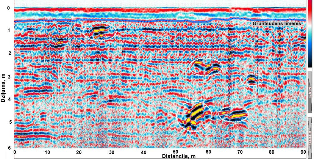Zem galvenās atstarošanas fāzes ir palielinātas signālu amplitūdas zones, kas atspoguļotas (izkliedētas) uz daudziem maziem objektiem. Šādi objekti uz GPR profila, visticamāk, tiek interpretēts kā aizbērta betona vai asfalta seguma fragmentus. Profila fragmenta no 0,2 m līdz 1,0 m dziļumā fiksētas daudzas fāzes difrakcijas viļņu hiperboliskās asis. Izteiktas difrakcijas liecina par blīvu svešķermeņu klātbūtni gruntī, iespējams, vecas ēkas betona struktūras fragmenti.Profilā tiek atzīmēti raksturīgi difrakcijas viļņi no mazākiem objektiem, iespējams, piemēram, caurulēm, sakaru kanāliem, akām utt. Attēlā ir parādīti piemēri šādas objektu izpausmei hiperbolisko viļņu paketes veidā.Spēcīgākās atstarojošās robežas, visticamāk, ir saistītas ar ūdens piesātinātu lēcu virsmām smilšu masīvā. Zemfrekvences radara zondēšana ir ļoti efektīva metode gruntsūdeņu virsmas kartēšanai smilšainos nogulumos. Tajā pašā laikā ar ūdeni piesātinātu augsņu virsma ir spēcīga ekranējuma robeža, zem kuras ir problemātiski atstarojošo robežu izsekošana smilšaina-māla masīvā.