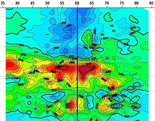 Ātruma griezums, kas iegūts caurspīdīguma laikā starp atvērtiem urbumu strobiem dziļuma intervālā no 19 līdz 69 m. Šis griezums ir divu tomogrāfisko attēlu pārklājums, kas iegūts, veicot pretpārraide no urbumam. 16A un 16ig.